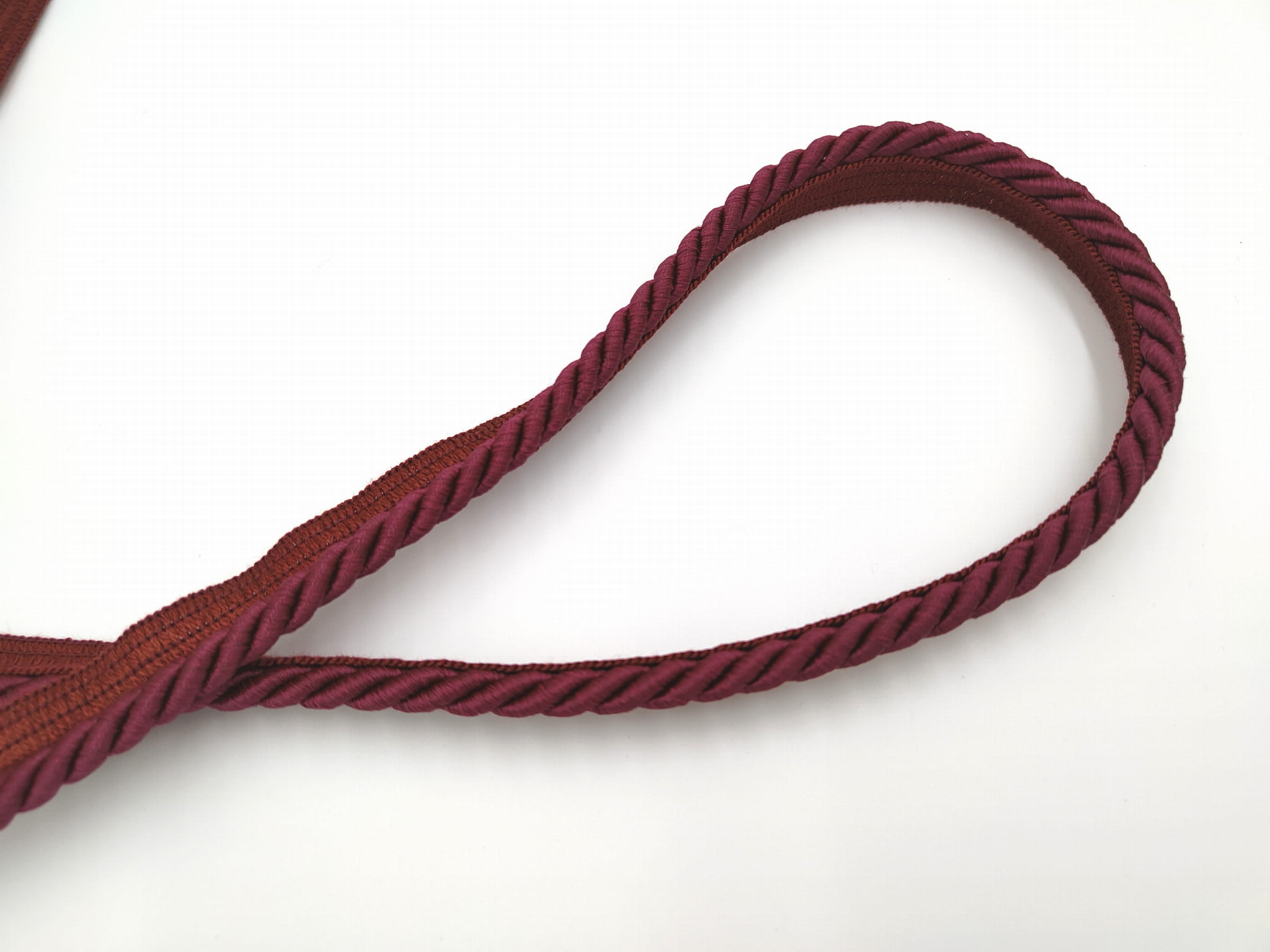 Sznur dekoracyjny w kolorze ciemnym bordowym, z lekkim połyskiem.