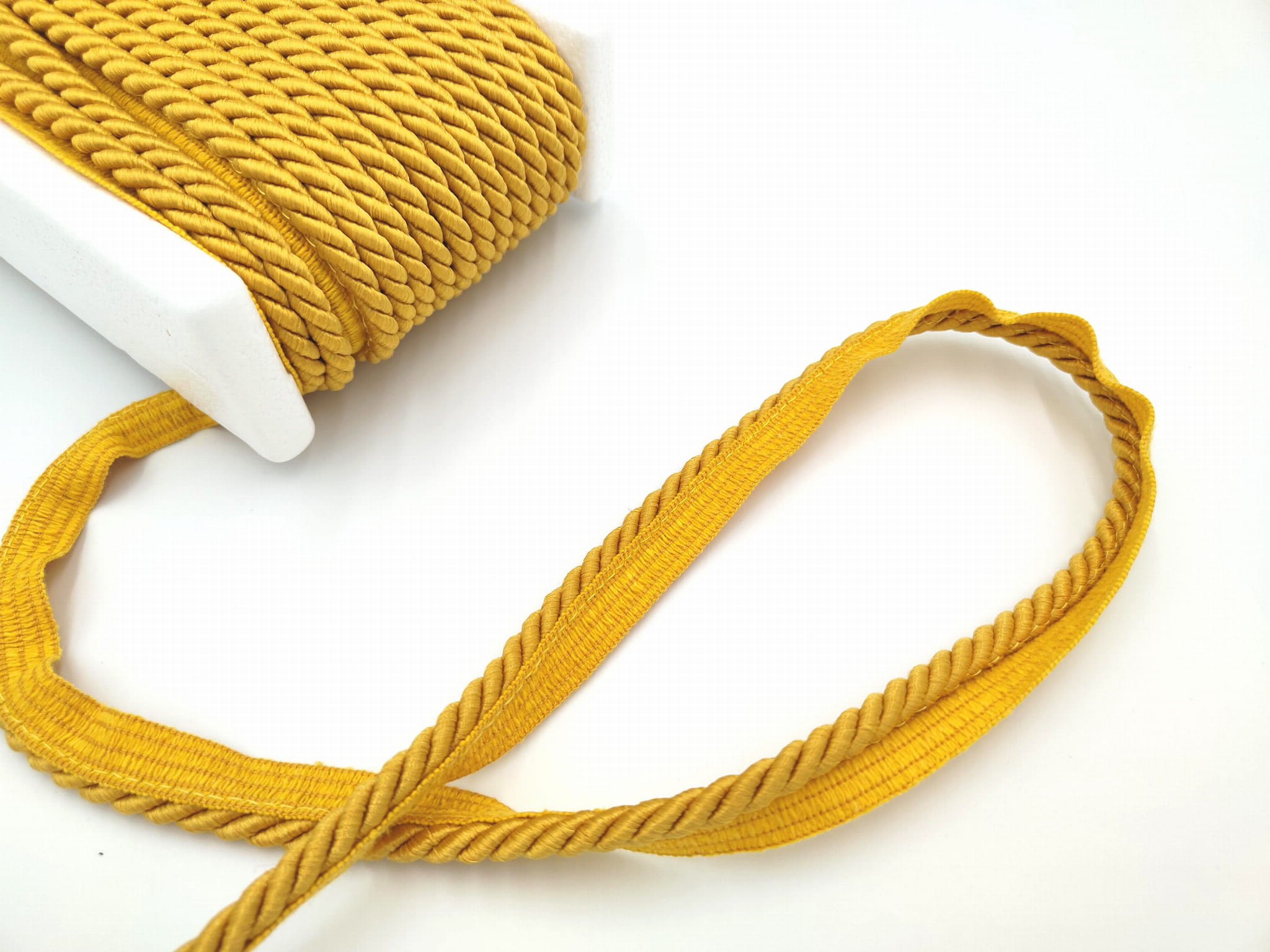 Sznur dekoracyjny w kolorze musztardowym, z lekkim połyskiem.