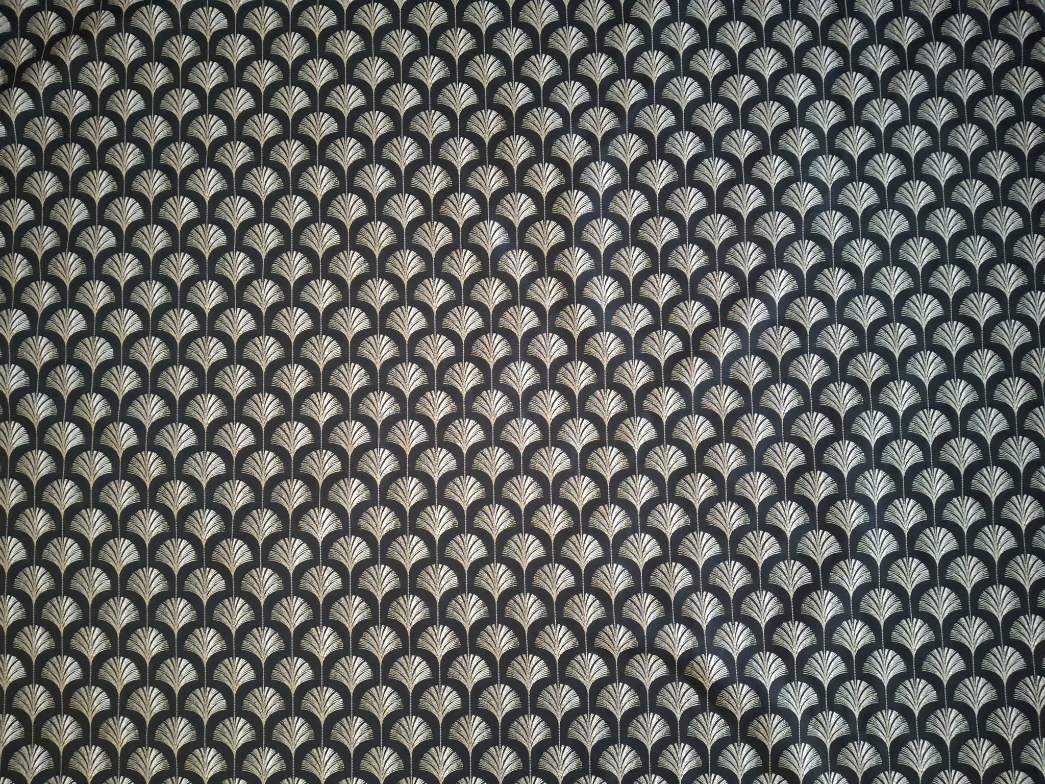 Unikatowa tkanina żakardowa we wzór złotych wachlarzy przypominających pawi ogon umieszczonych na czarnym tle.