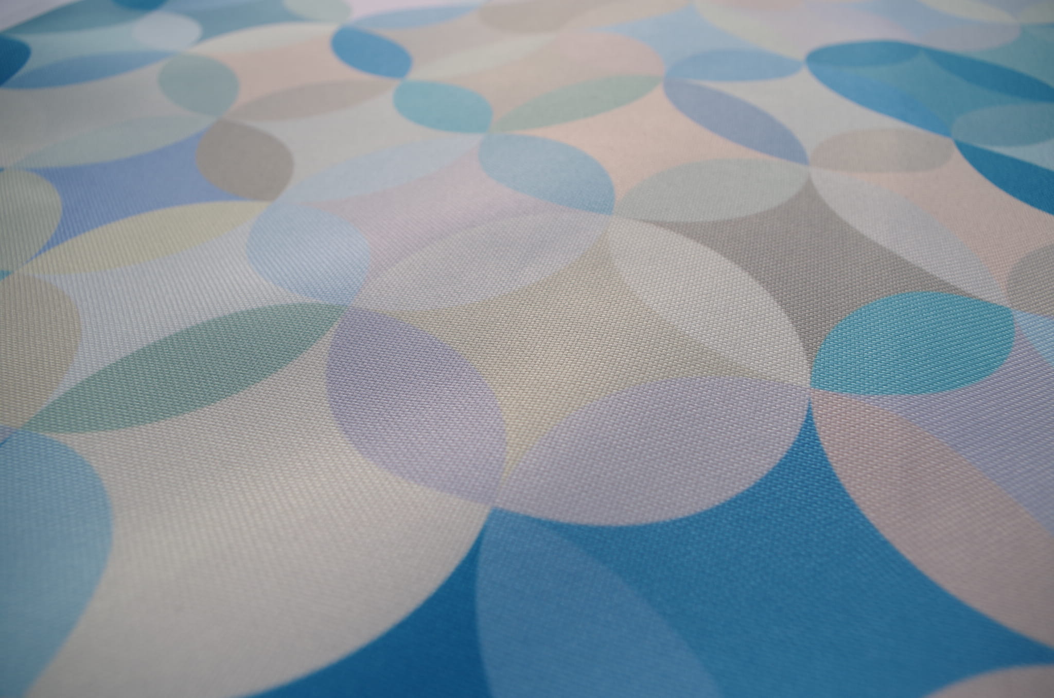 Tkanina tapicerska poliester drukowany z nowoczesnym wzorem kolorowych kół w klimacie retro w odcieniu turkusowym.