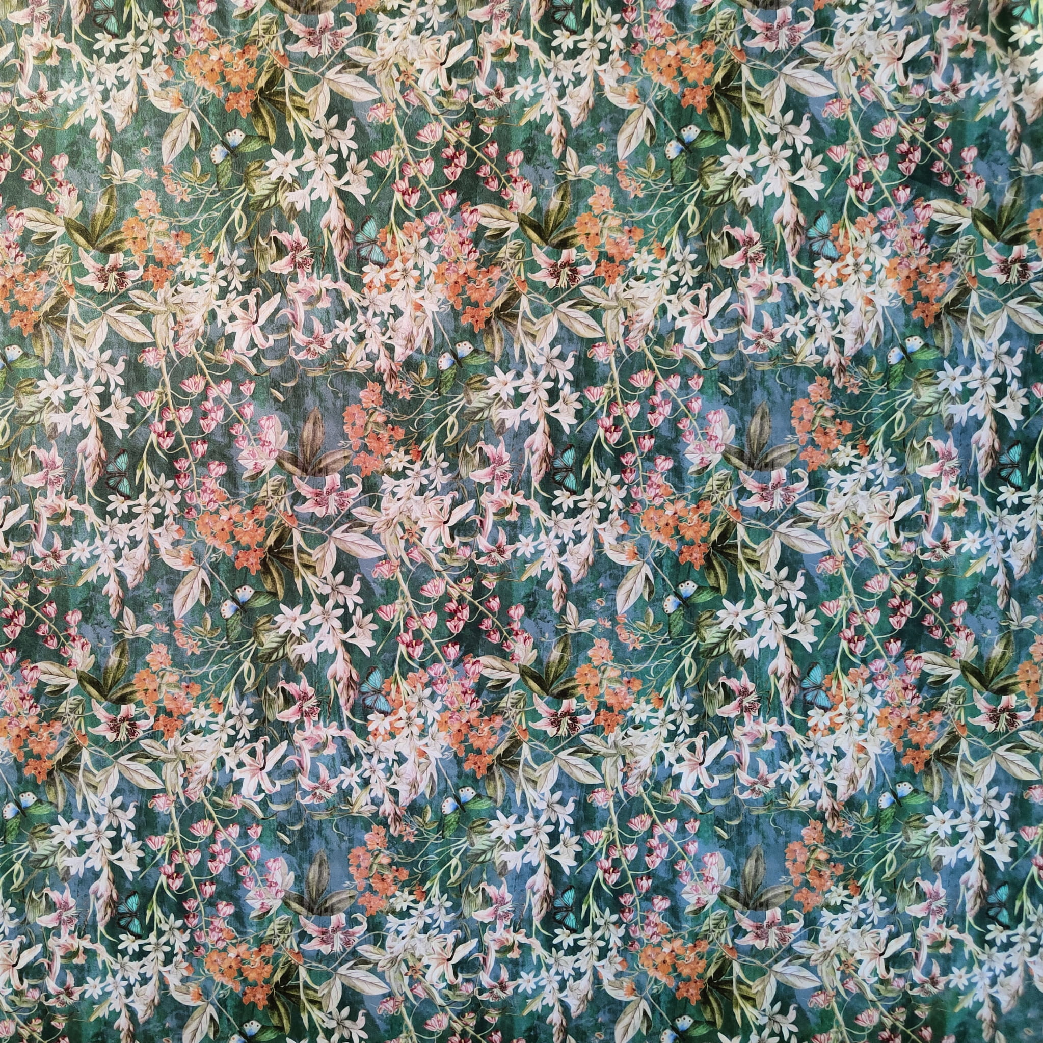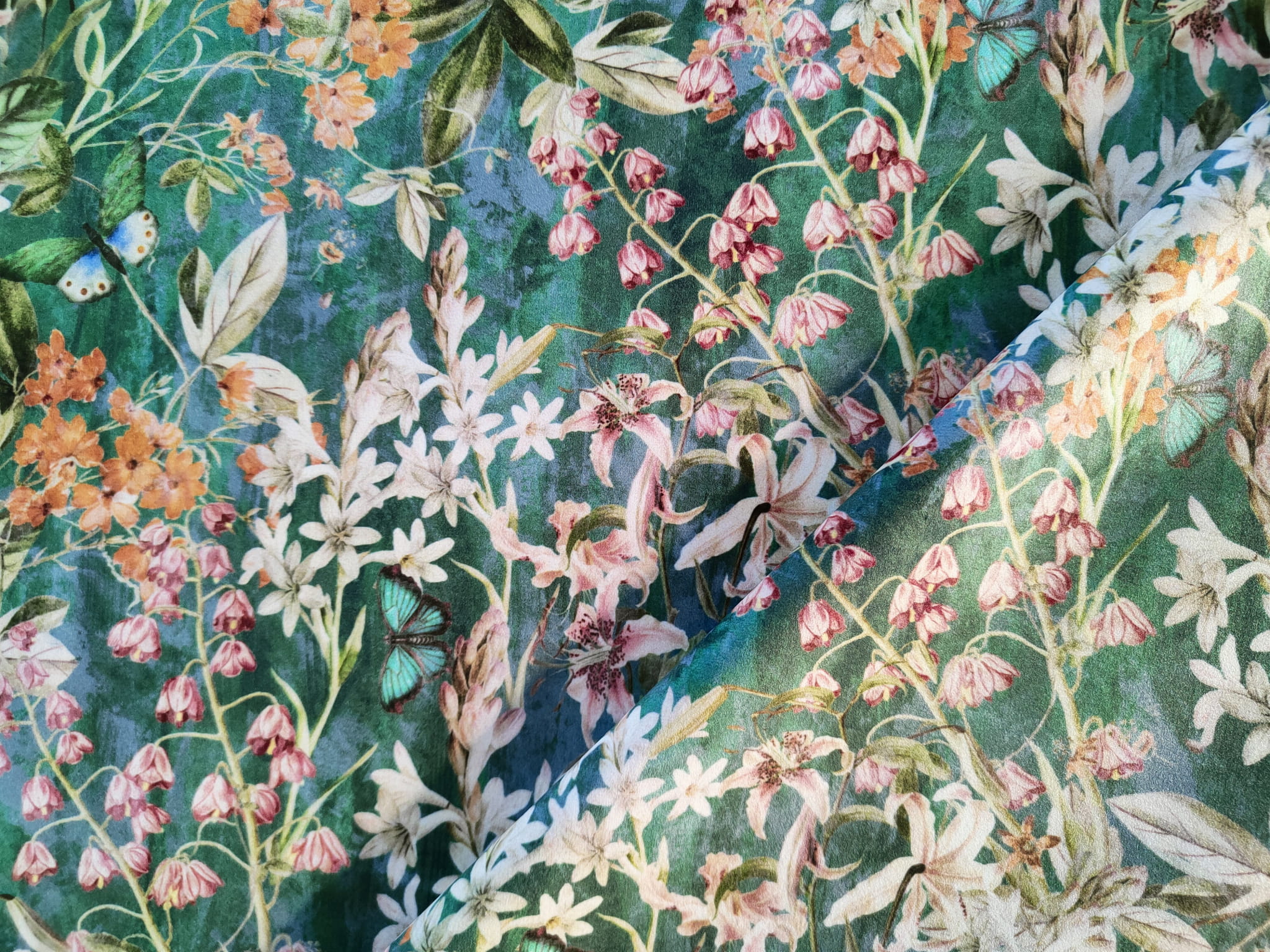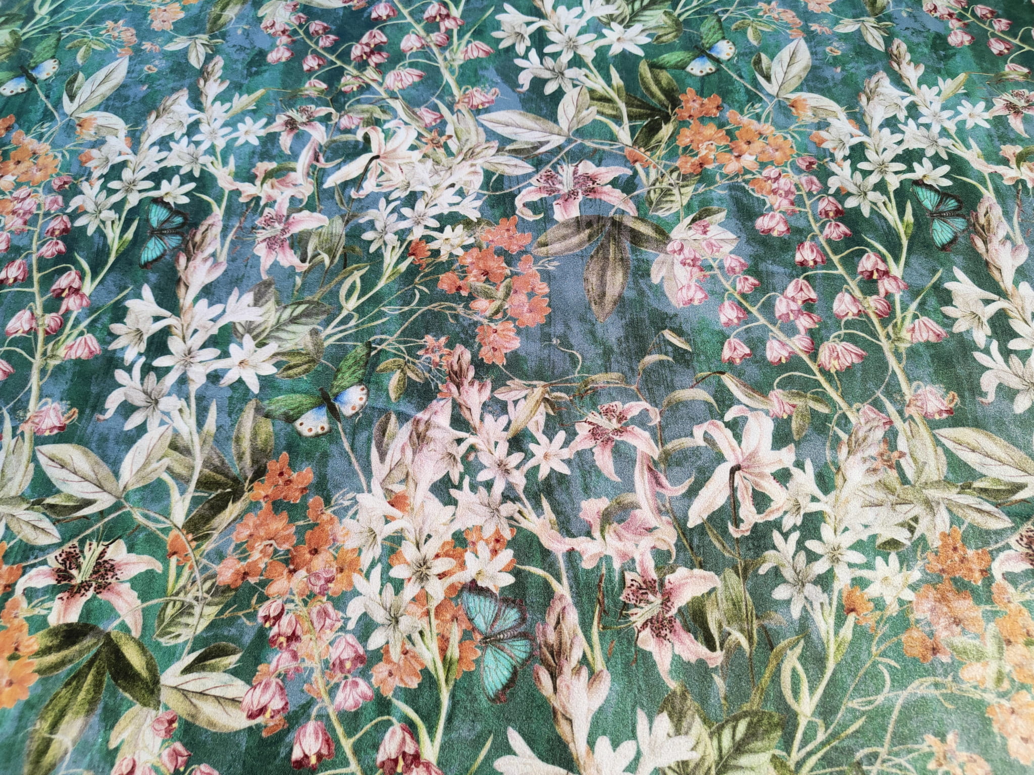 Unikatowa tkanina welurowa w niespotykany wzór łąkowych kwiatów w otoczeniu pięknych motyli. Zielone tło z delikatnym efektem rozmycia sprawia, że materiał drukowany ze wzorem kwiatów stanowi idealną propozycję dla miłośników urządzania wnętrz. Wzór nadaje aranżacji wyjątkowego charakteru i pozwala stworzyć niepowtarzalny projekt wnętrza.