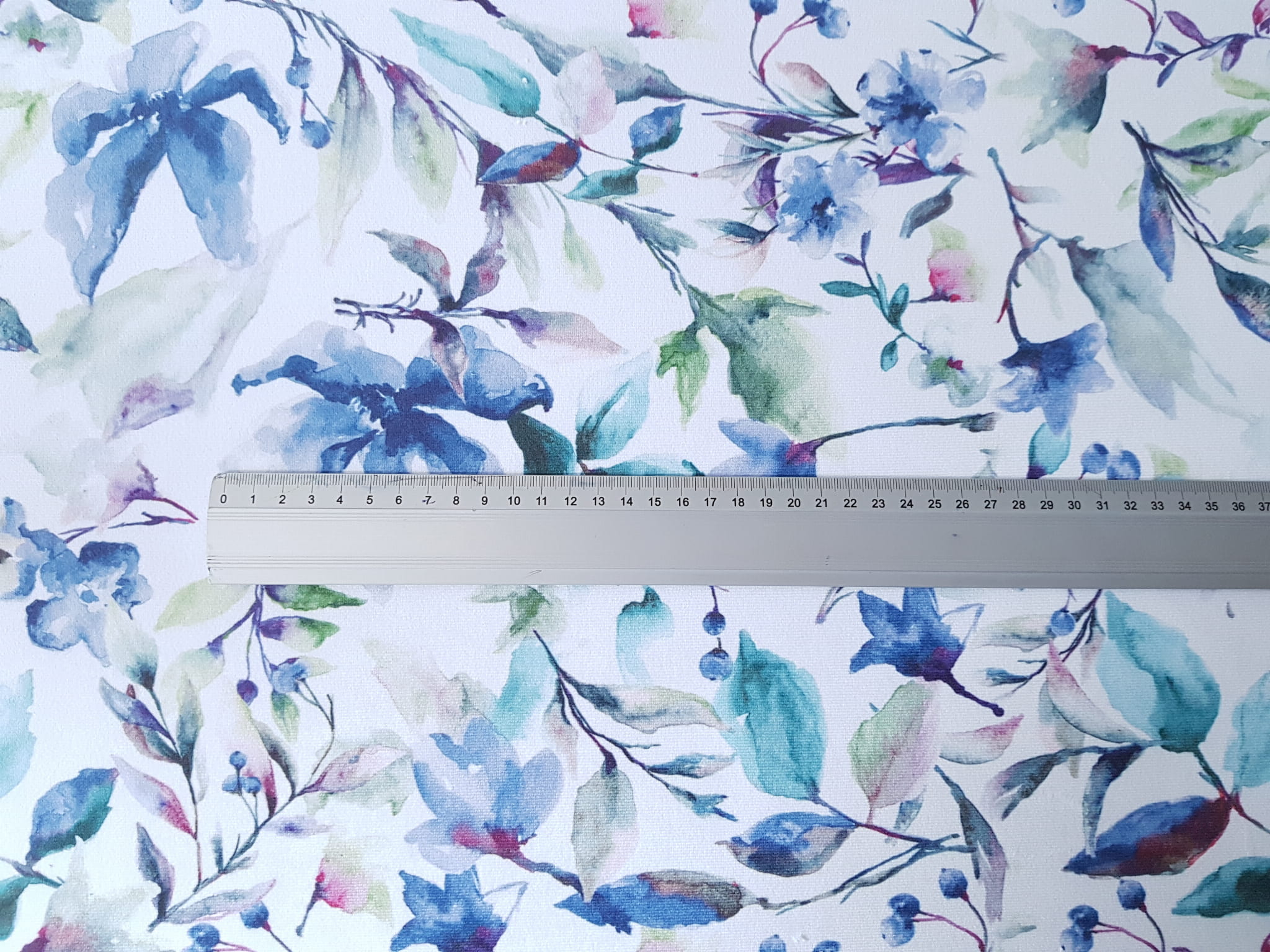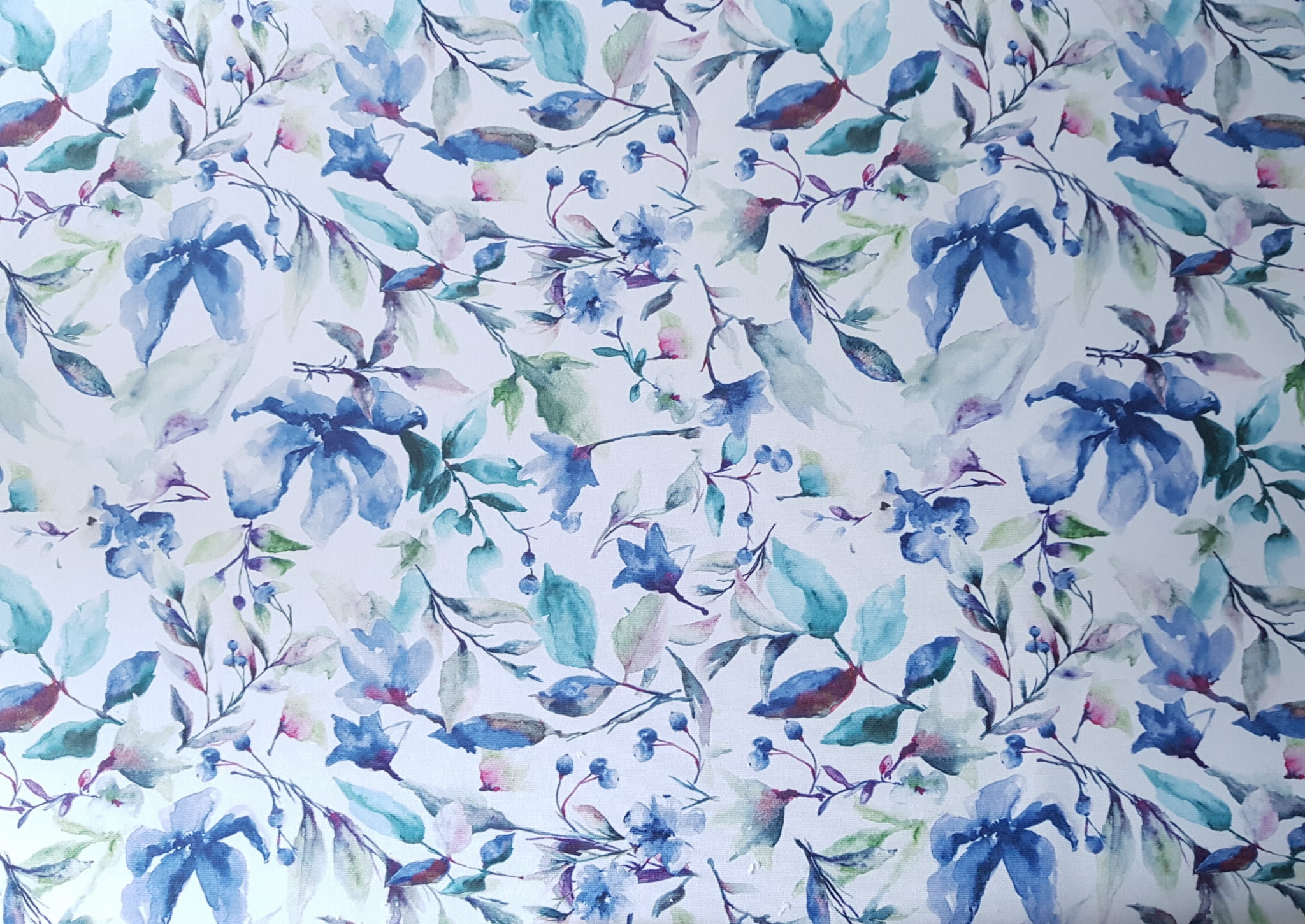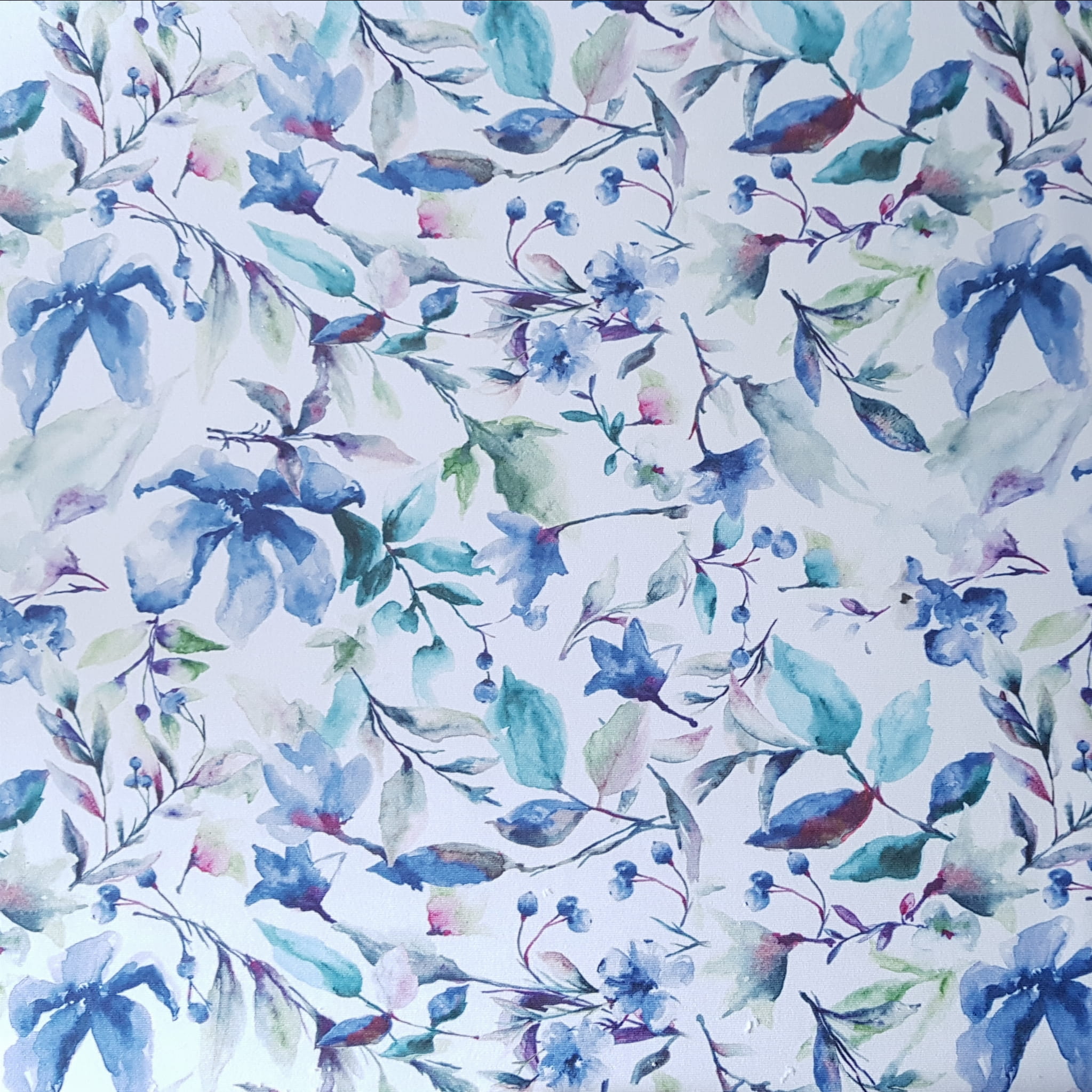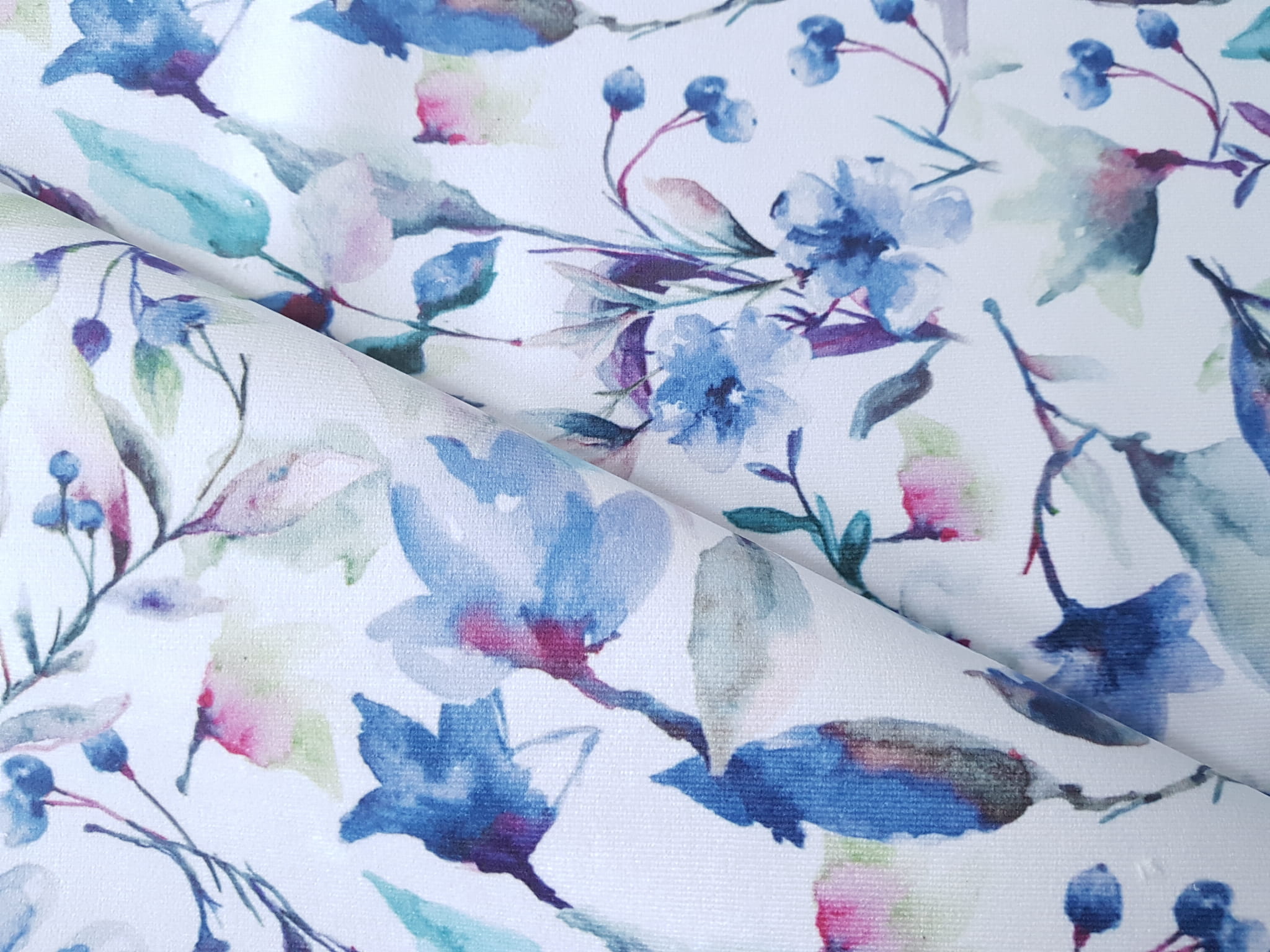 Tkanina tapicerska welur drukowany z nietuzinkowym wzorem akwarelowych kwiatów w kolorze niebieskim.