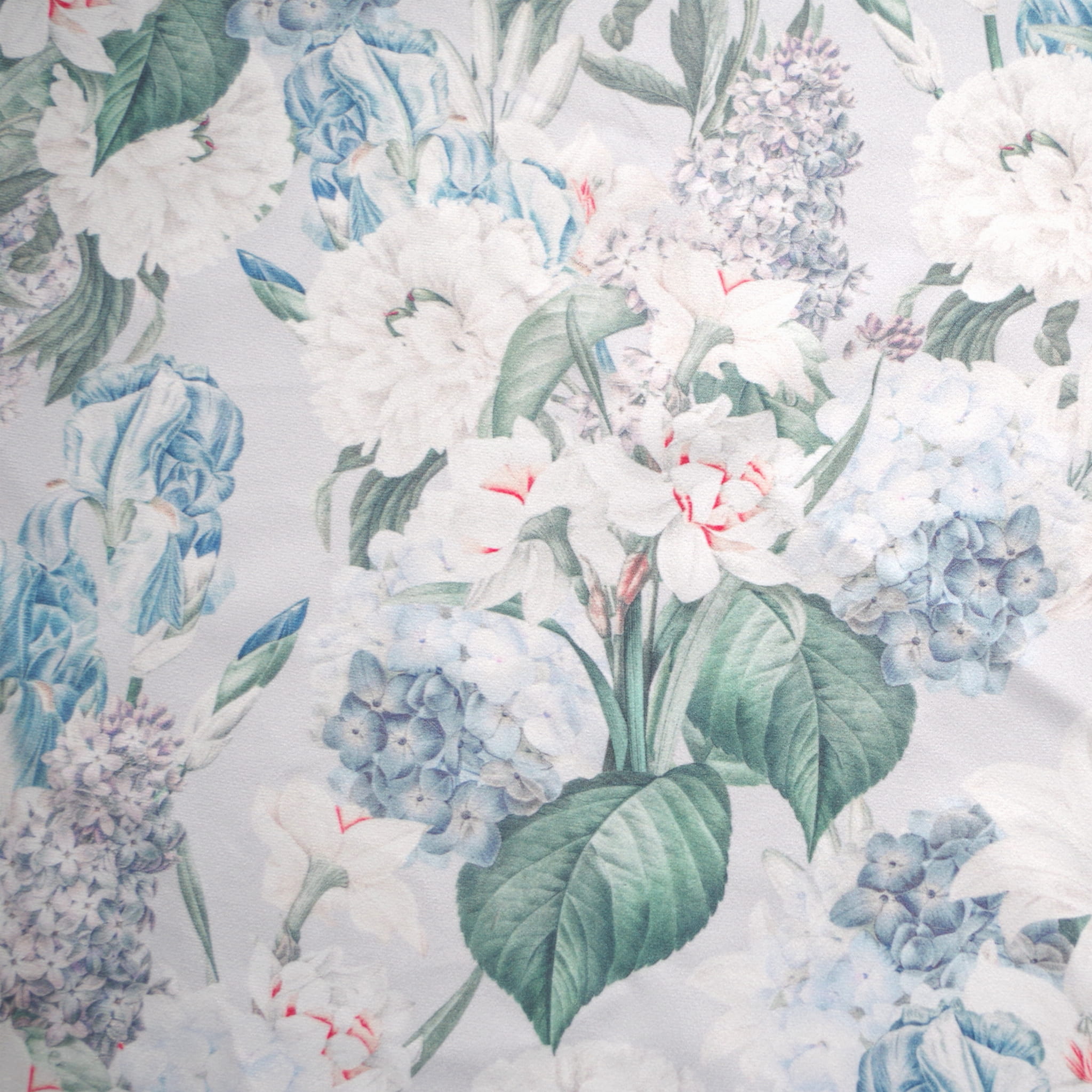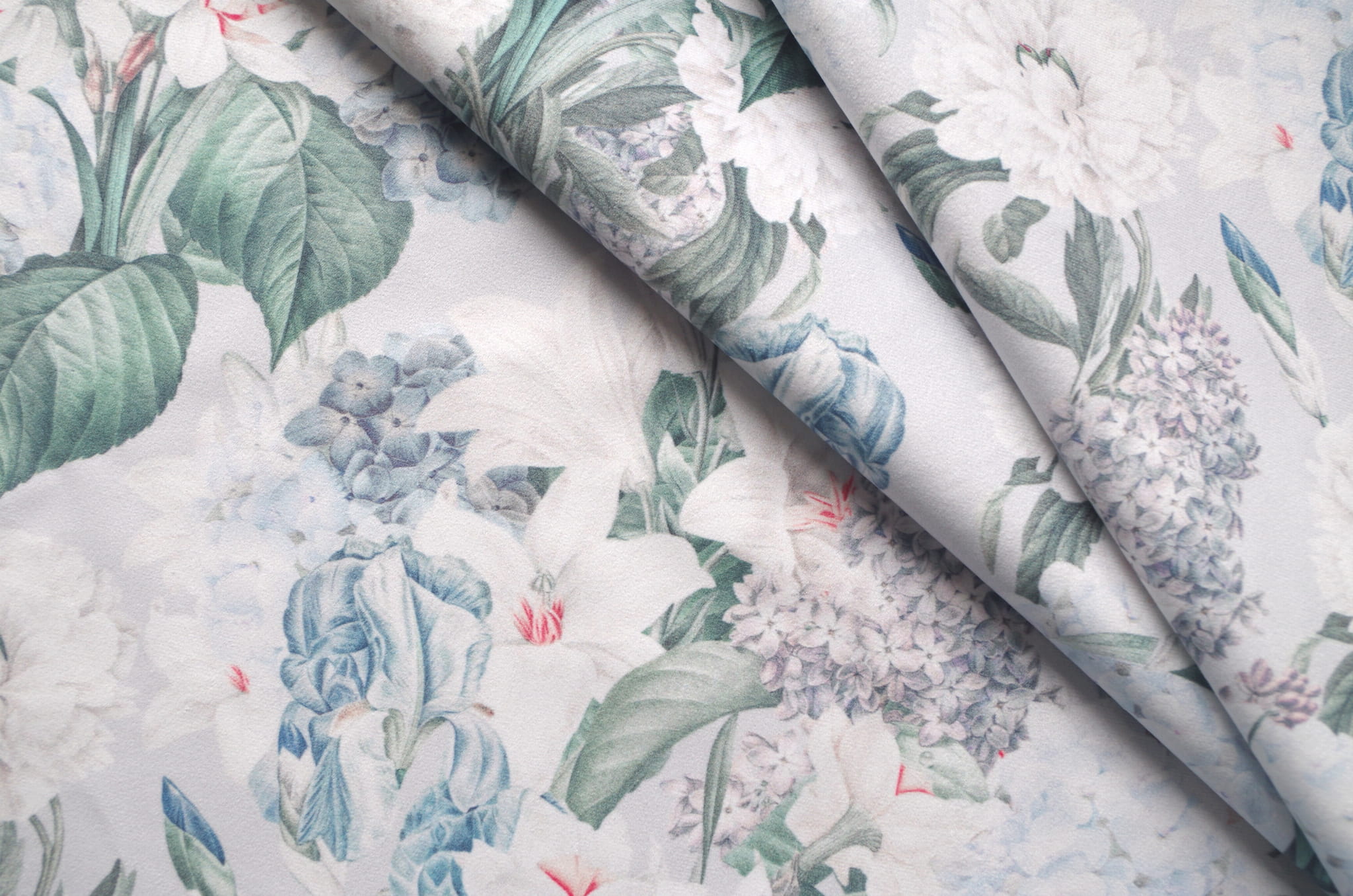 Tkanina tapicerska welur drukowany z pięknym wzorem niebieskich kwiatów bzu w otoczeniu białych lilii na szarym tle.