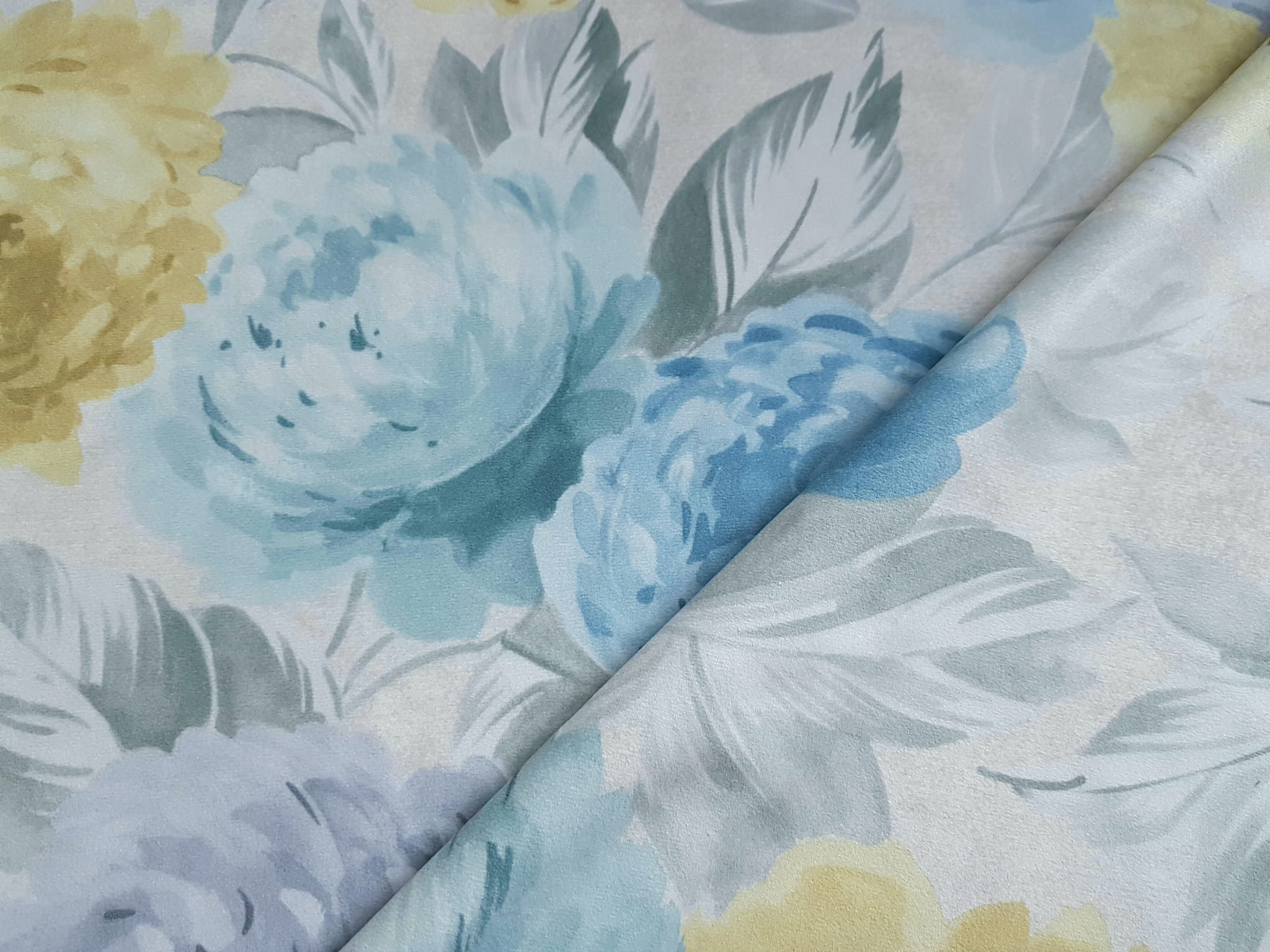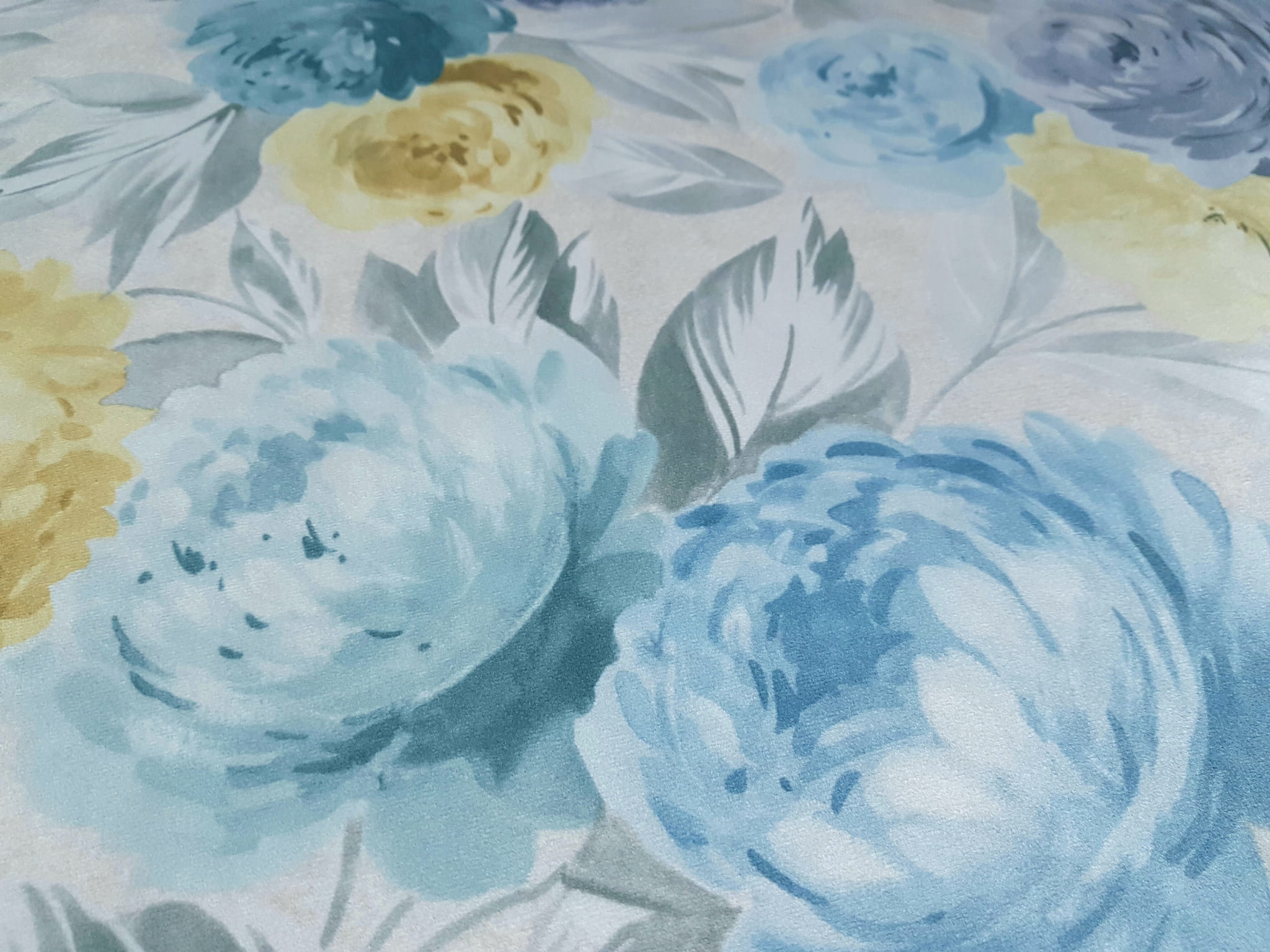 Tkanina tapicerska welur drukowany z pięknym wzorem błękitnych i żółtych piwonii na beżowym tle.
