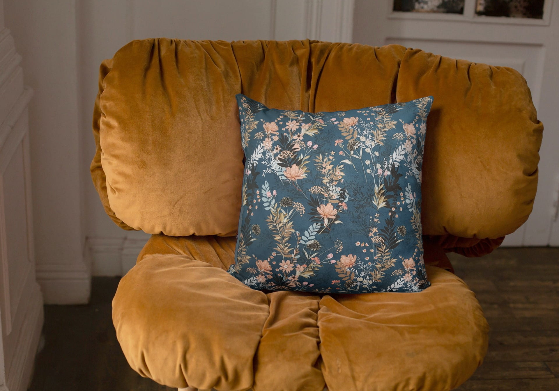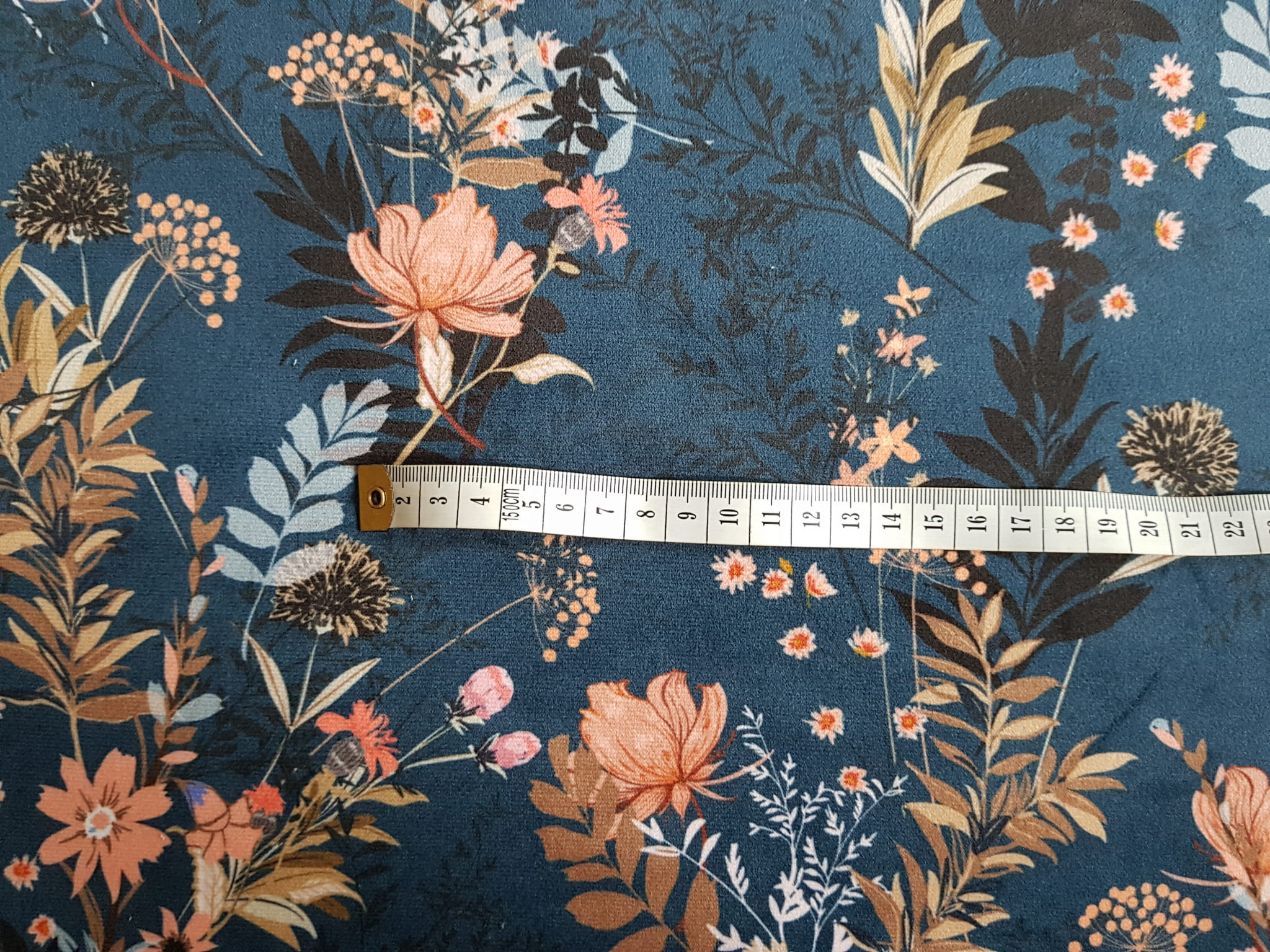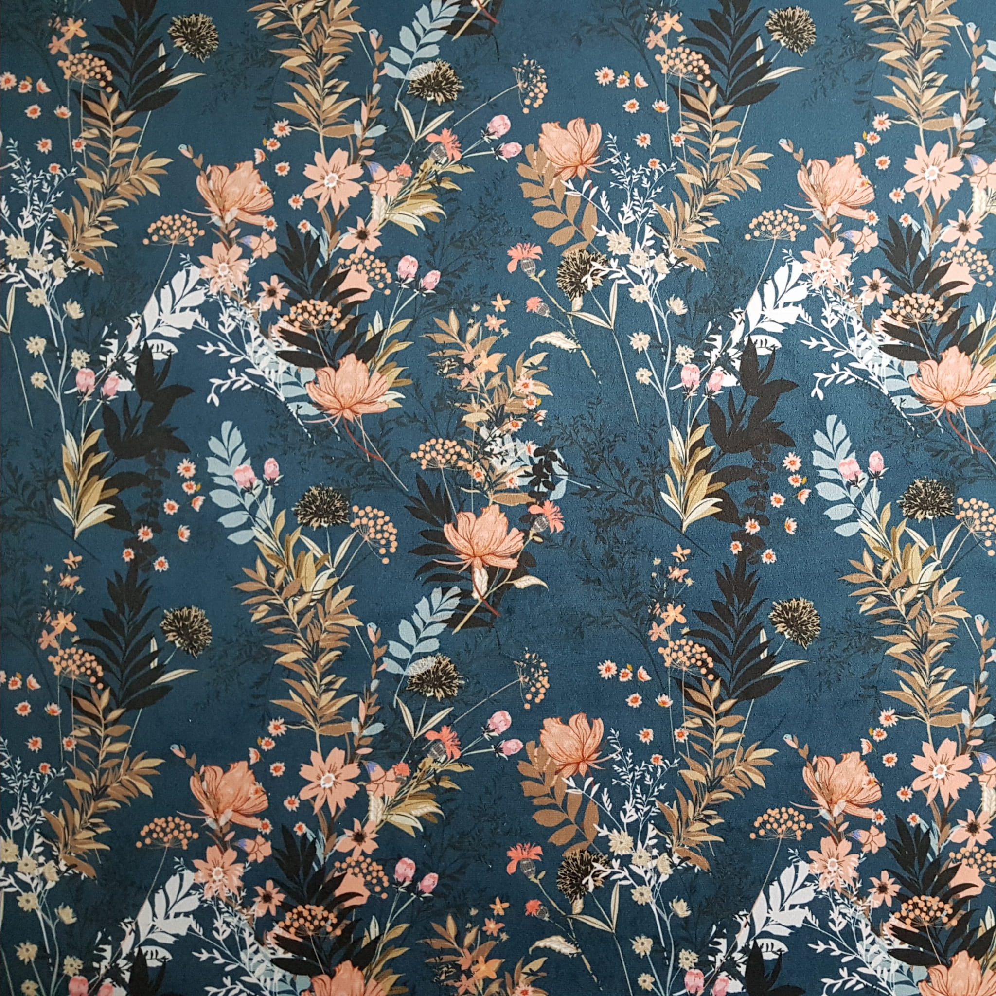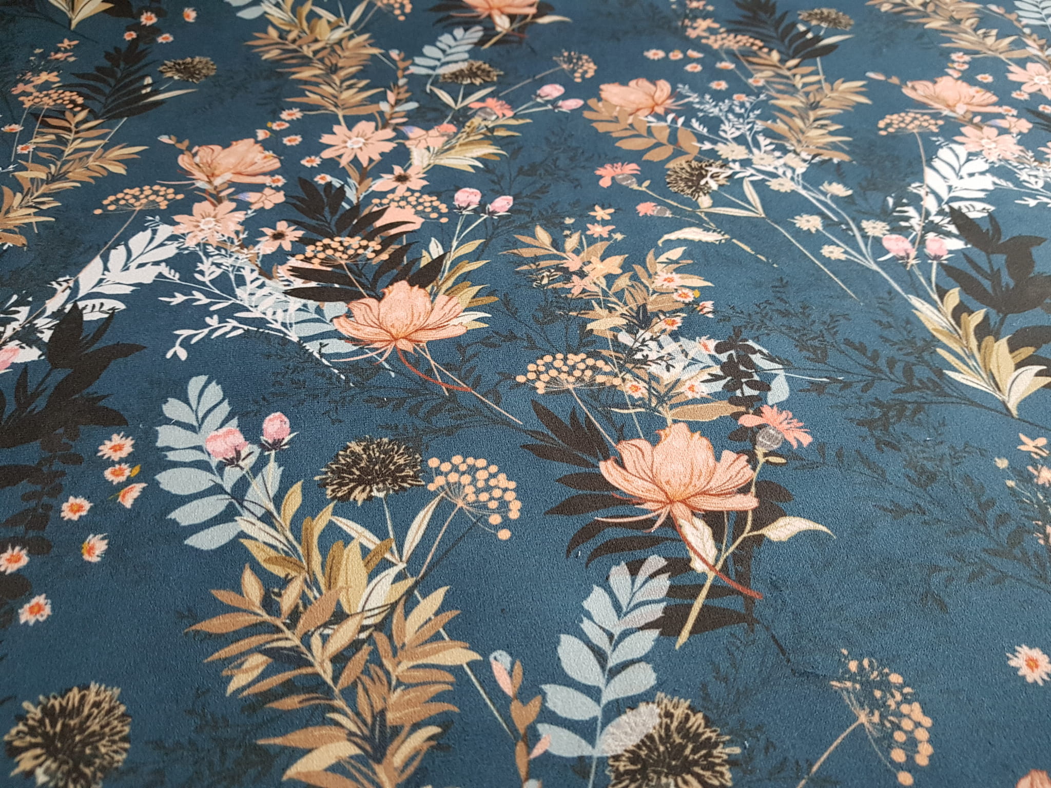 Tkanina tapicerska welur drukowany z pięknym wzorem polnych kwiatów na granatowym tle.