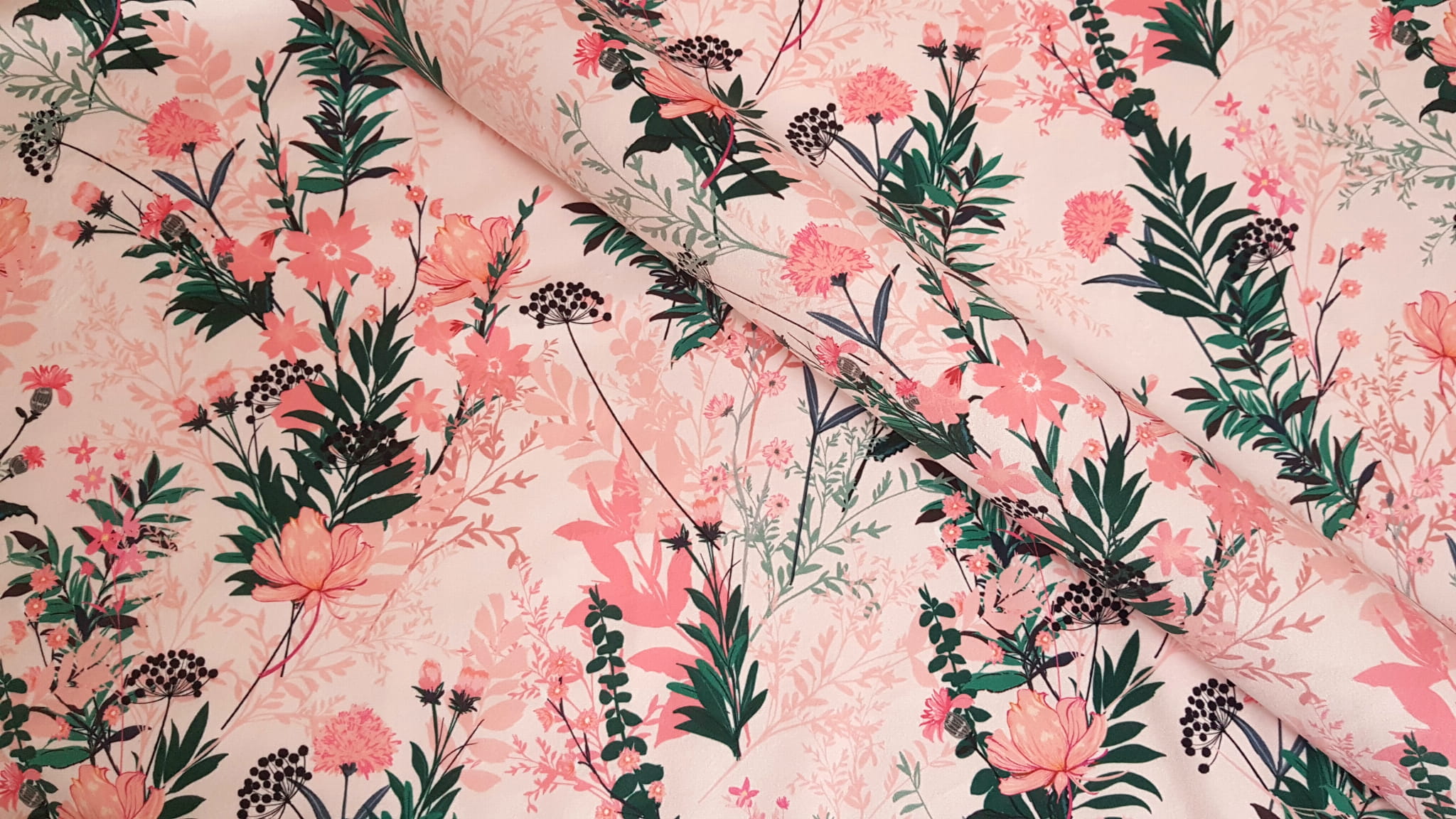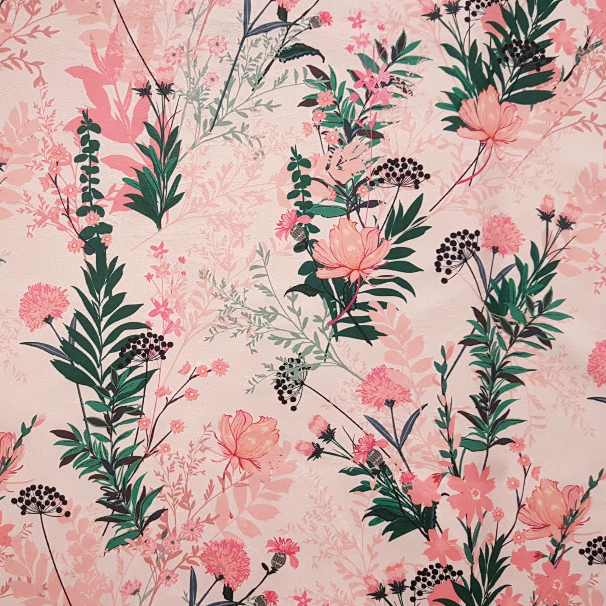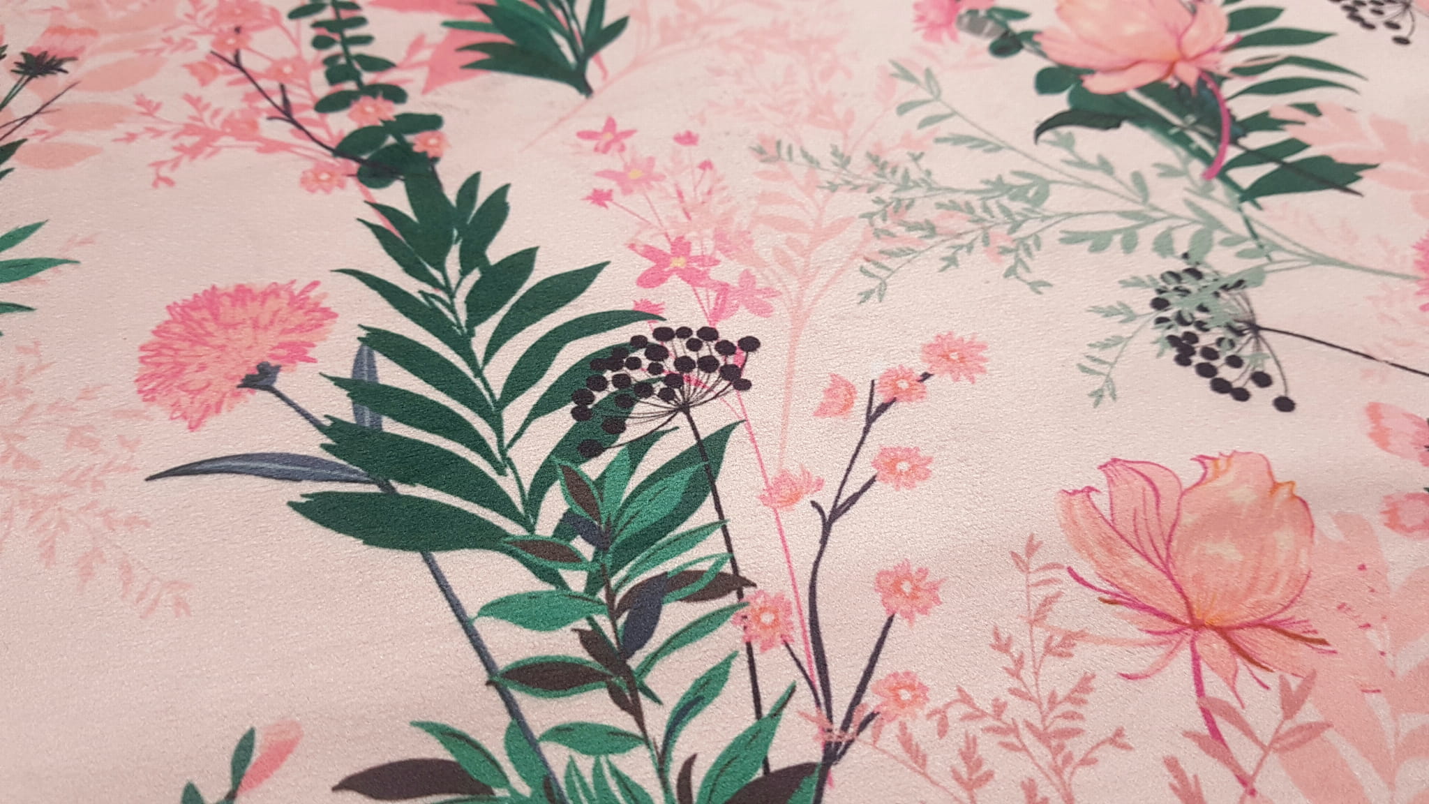 Tkanina tapicerska welur drukowany z pięknym wzorem polnych kwiatów na różowym tle.