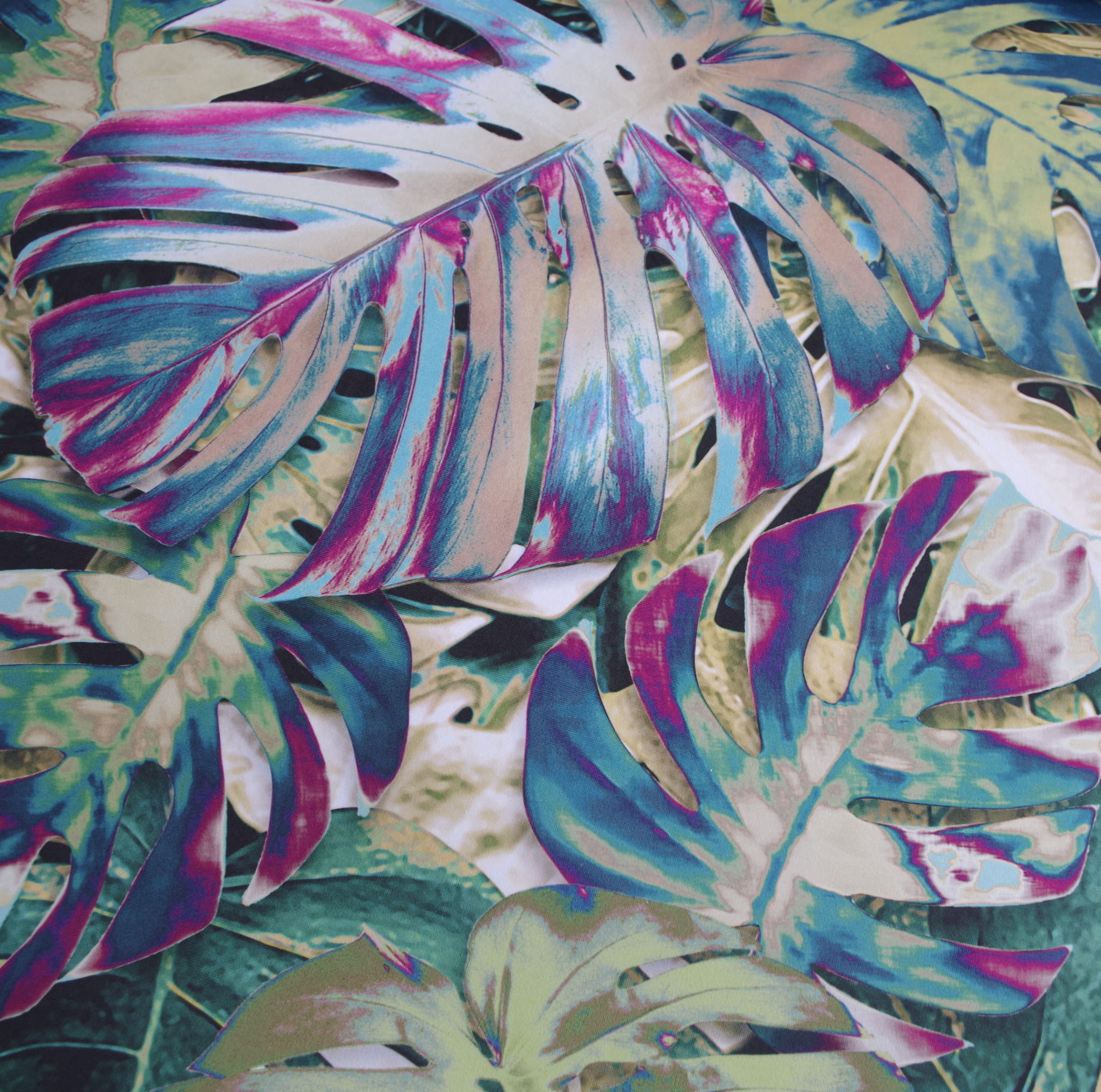 Tkanina tapicerska welur drukowany z nowoczesnym wzorem w klimatach botanicznych w kolorowe liście monstery.