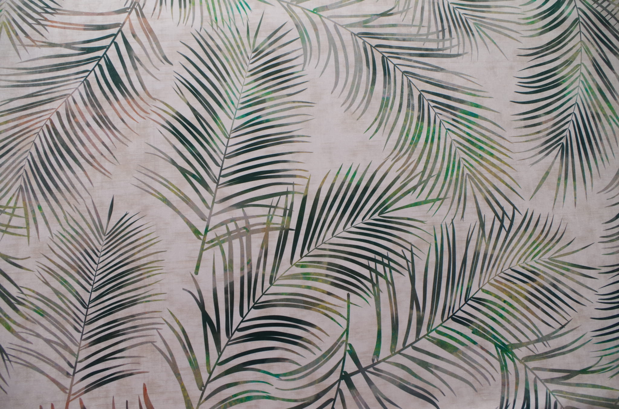 Tkanina tapicerska welur drukowany z nowoczesnym wzorem tropikalnych liści na beżowym tle.