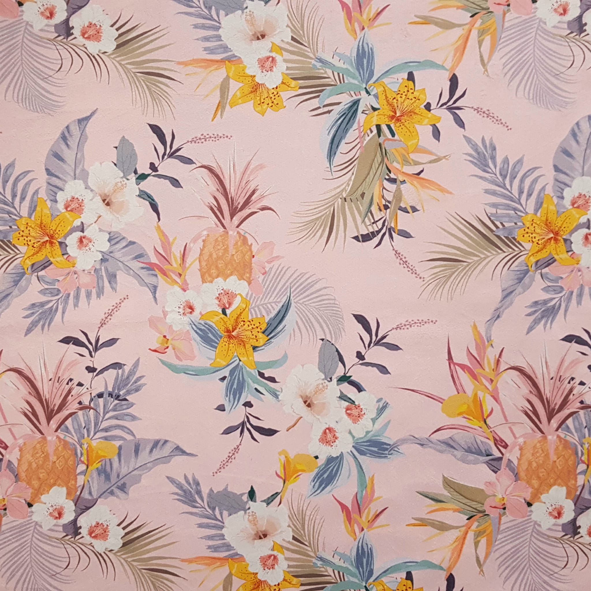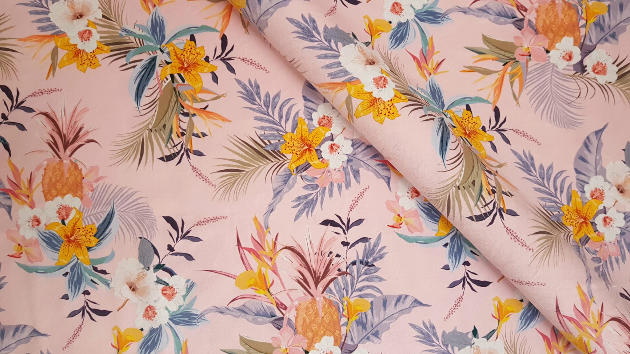 Tkanina tapicerska welur drukowany z pięknym wzorem ananasów w otoczeniu tropikalnych liści na różowym tle.