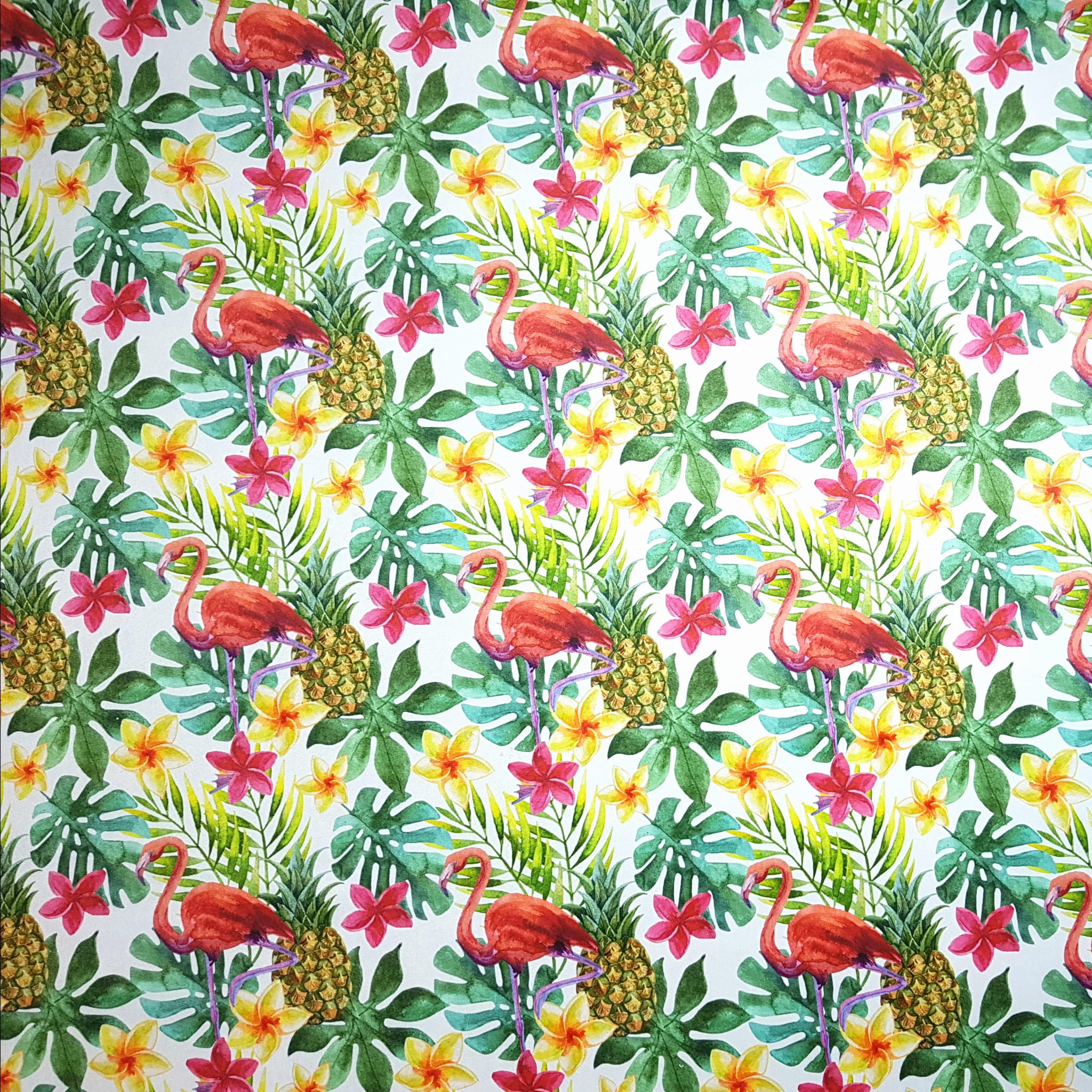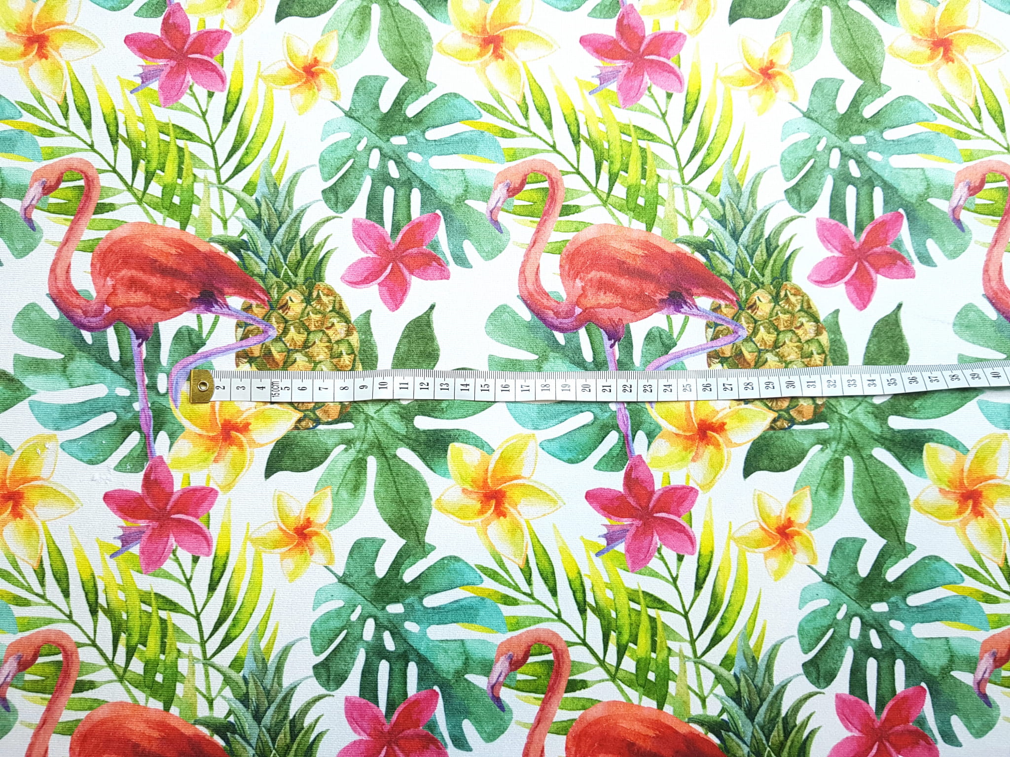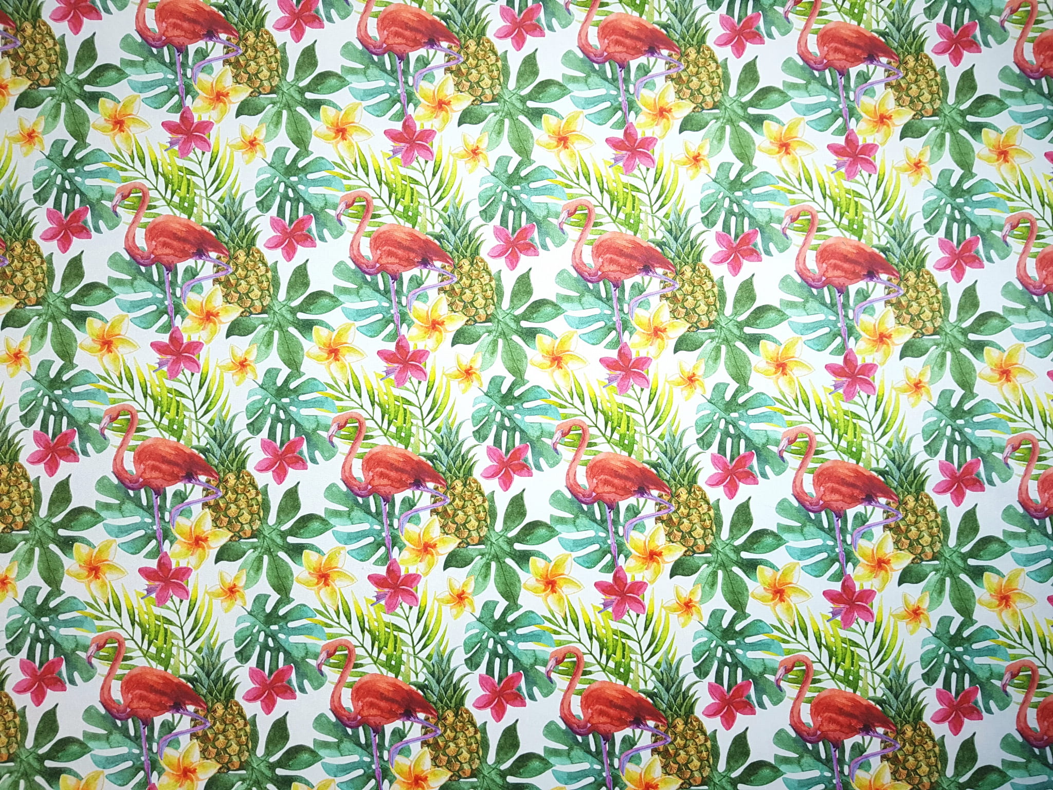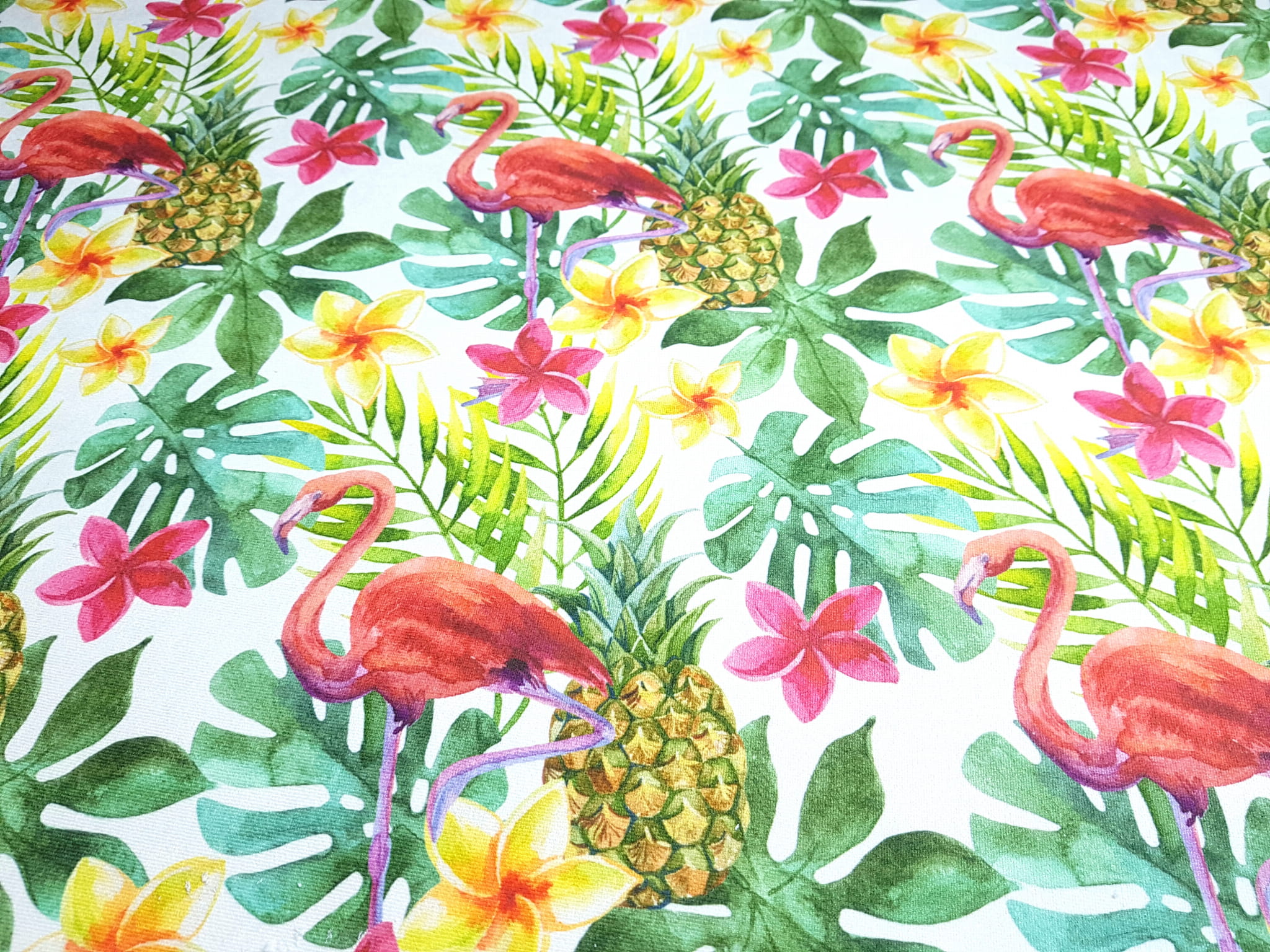 Tkanina tapicerska welur drukowany z bardzo energetycznym wzorem różowych flamingów w otoczeniu tropikalnych liści monstery.