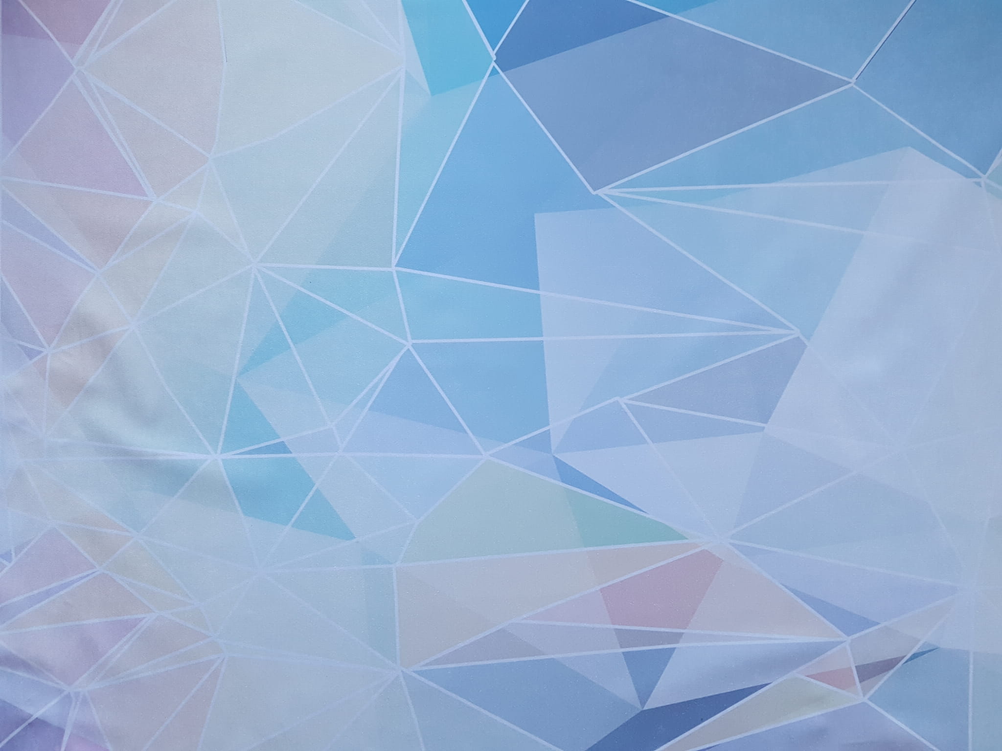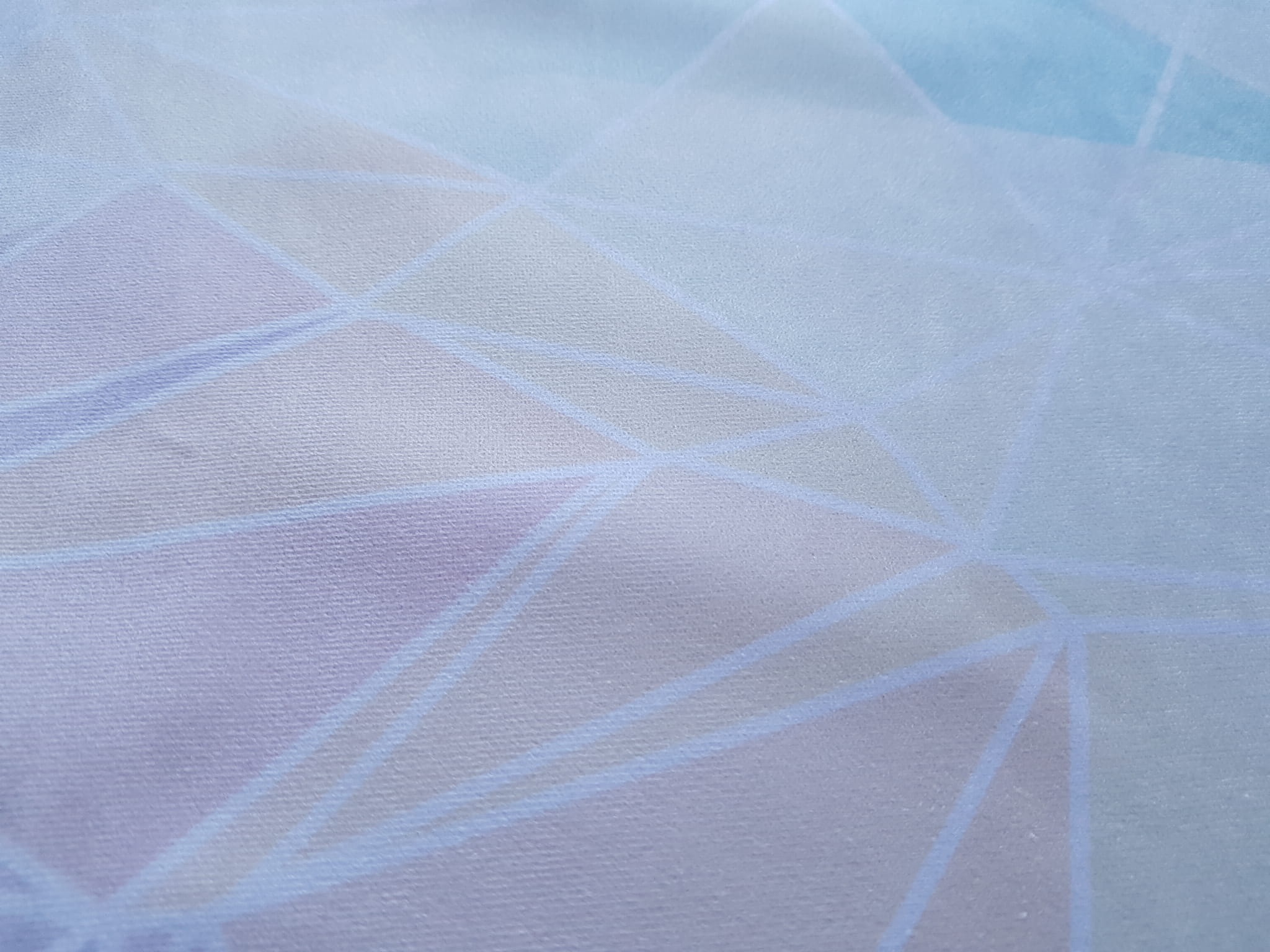 Tkanina tapicerska welur drukowany z nowoczesnym wzorem geometrycznych trójkątów w kolorach tęczy, na tkaninie występują trójkąty zarówno w intensywnych, jak i bardziej pastelowych barwach.