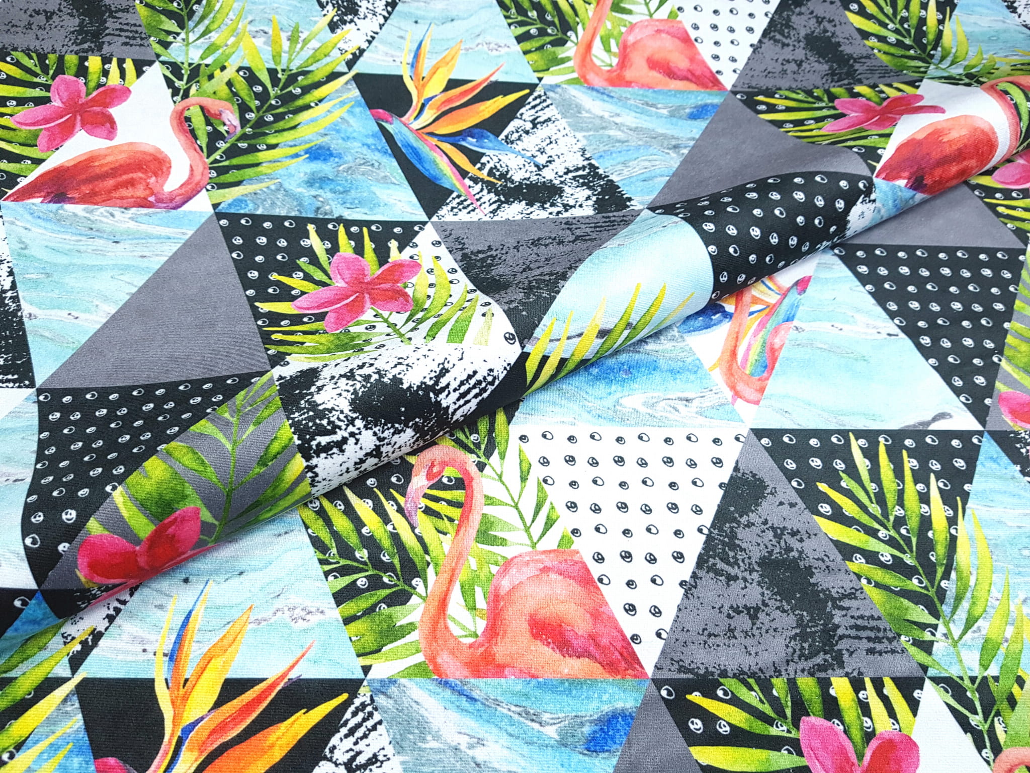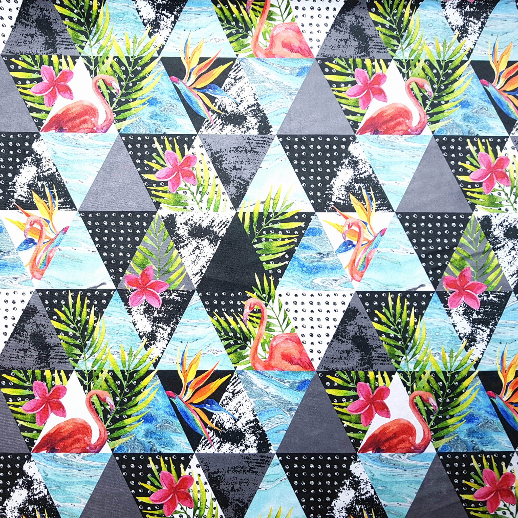 Tkanina tapicerska welur drukowany z bardzo energetycznym wzorem kolorowych trójkątów w otoczeniu różowych flamingów.