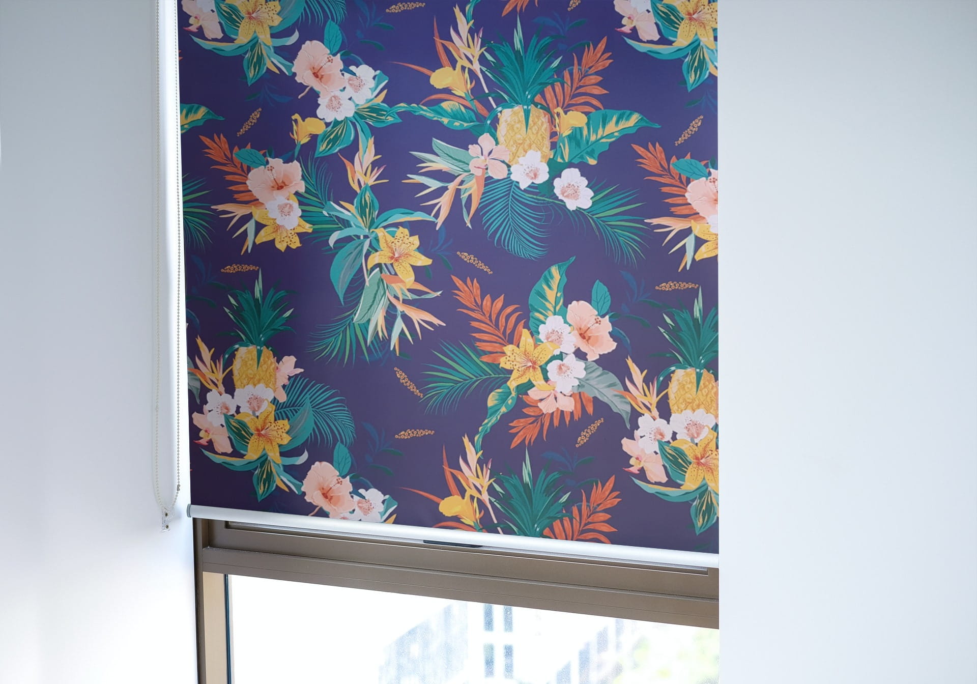 Tkanina tapicerska welur drukowany z pięknym wzorem ananasów w otoczeniu tropikalnych liści na ciemnym tle.
