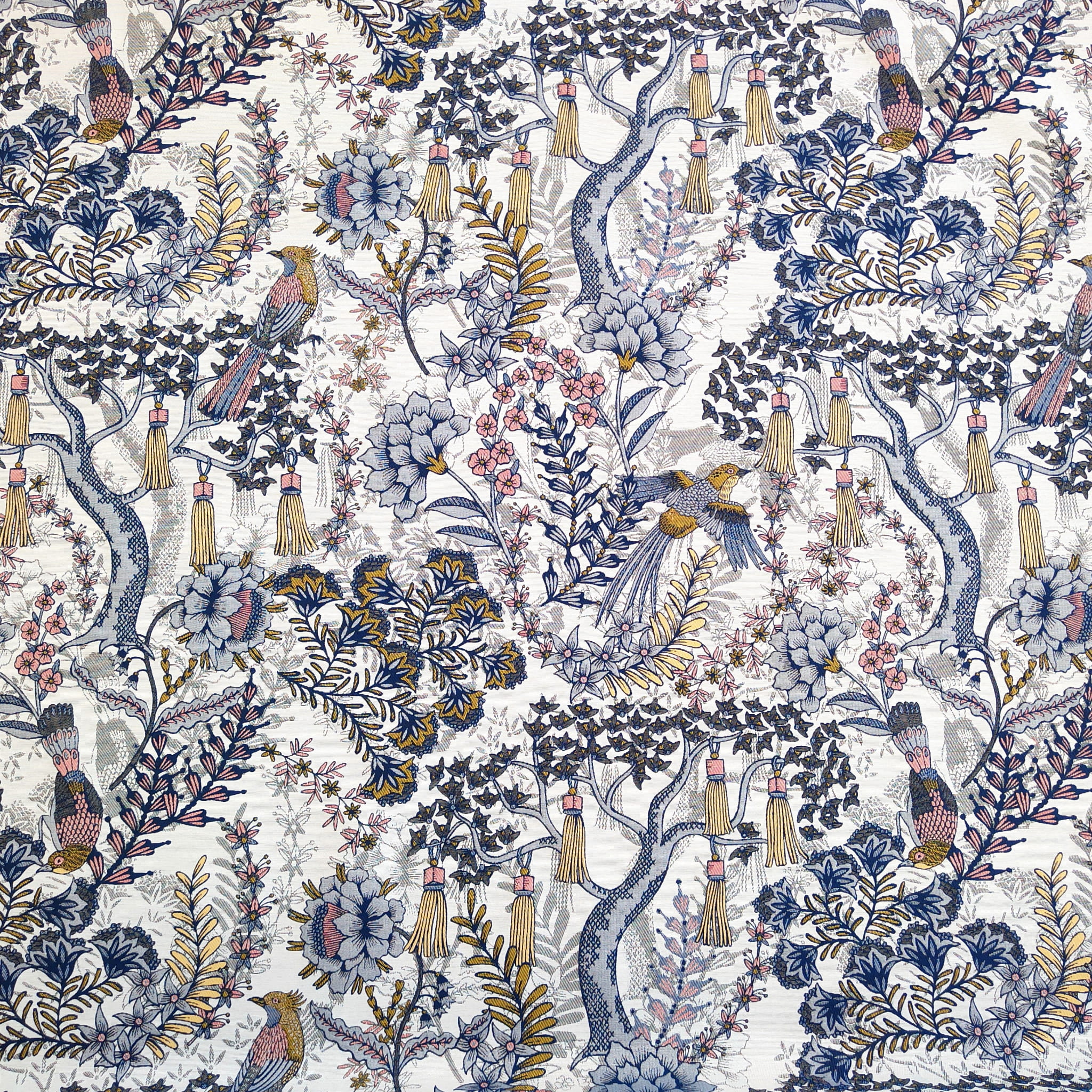 Unikatowa tkanina żakardowa w niespotykany wzór egzotycznych drzew, liści i ptaków w stonowanych barwach szarości, granatu i bieli. Przełamanie stanowi dodatek akcentu pastelowego różu i żółtego.