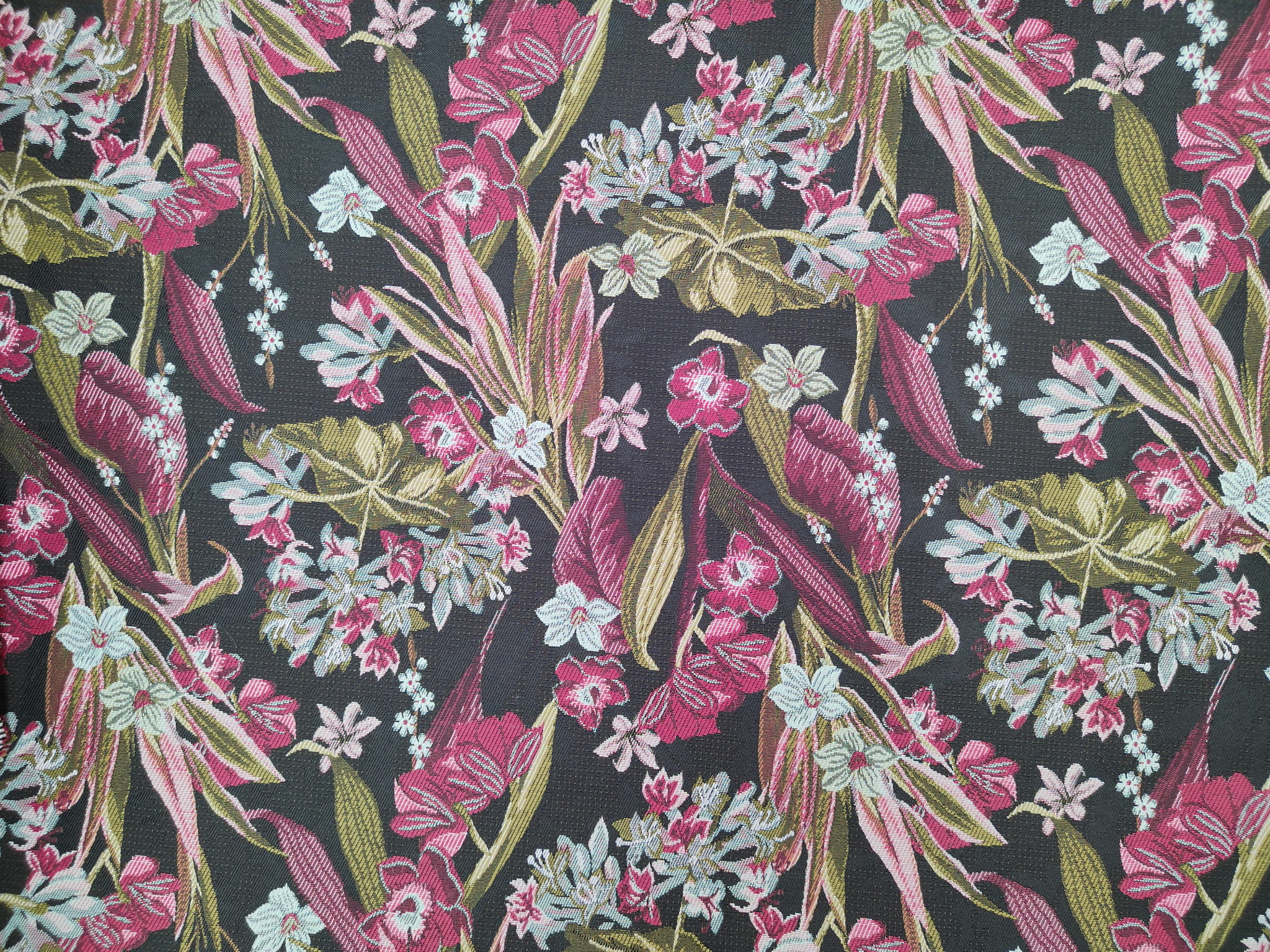 Unikatowa tkanina żakardowa w różowe kwiaty na czarnym tle.