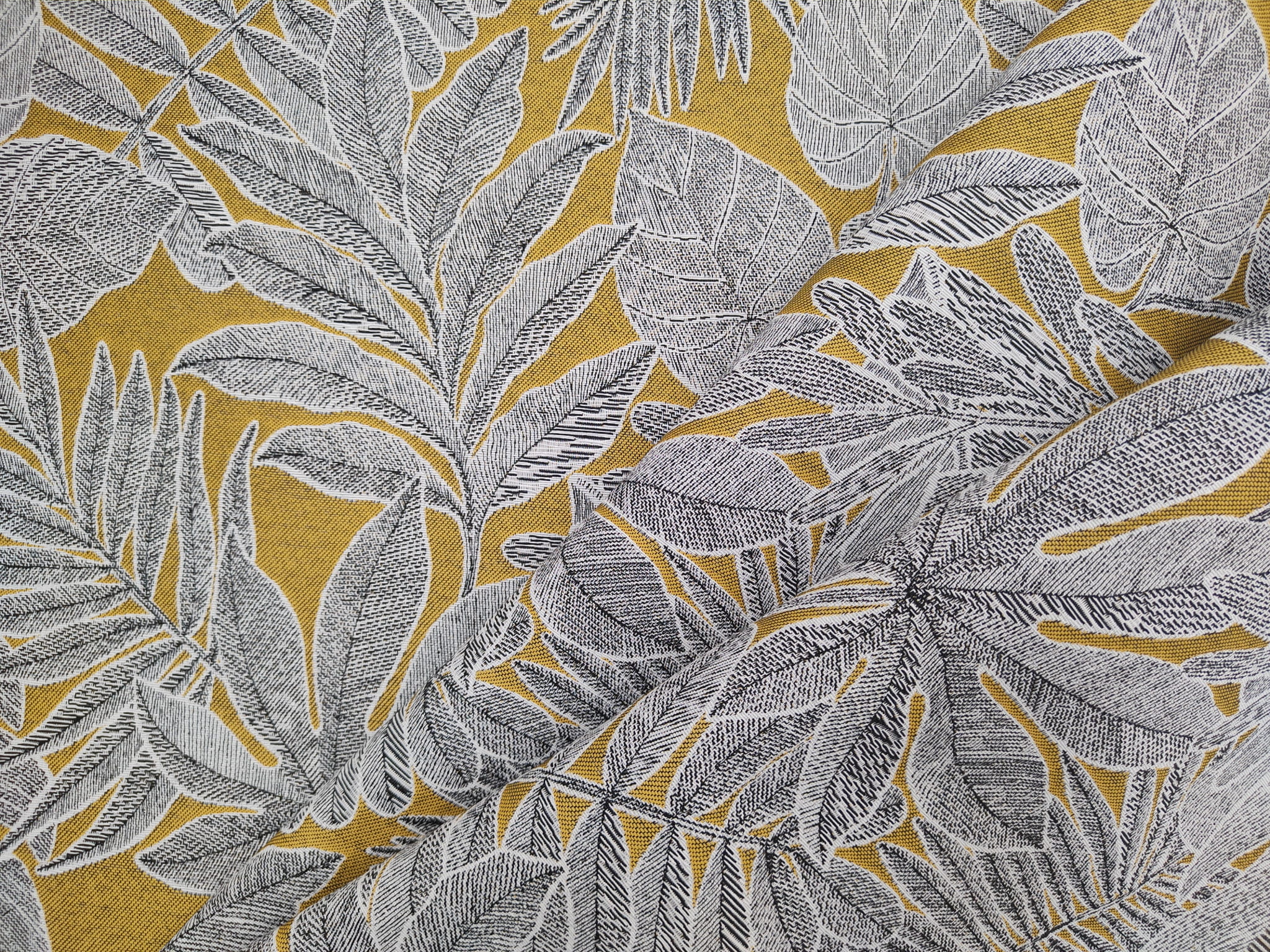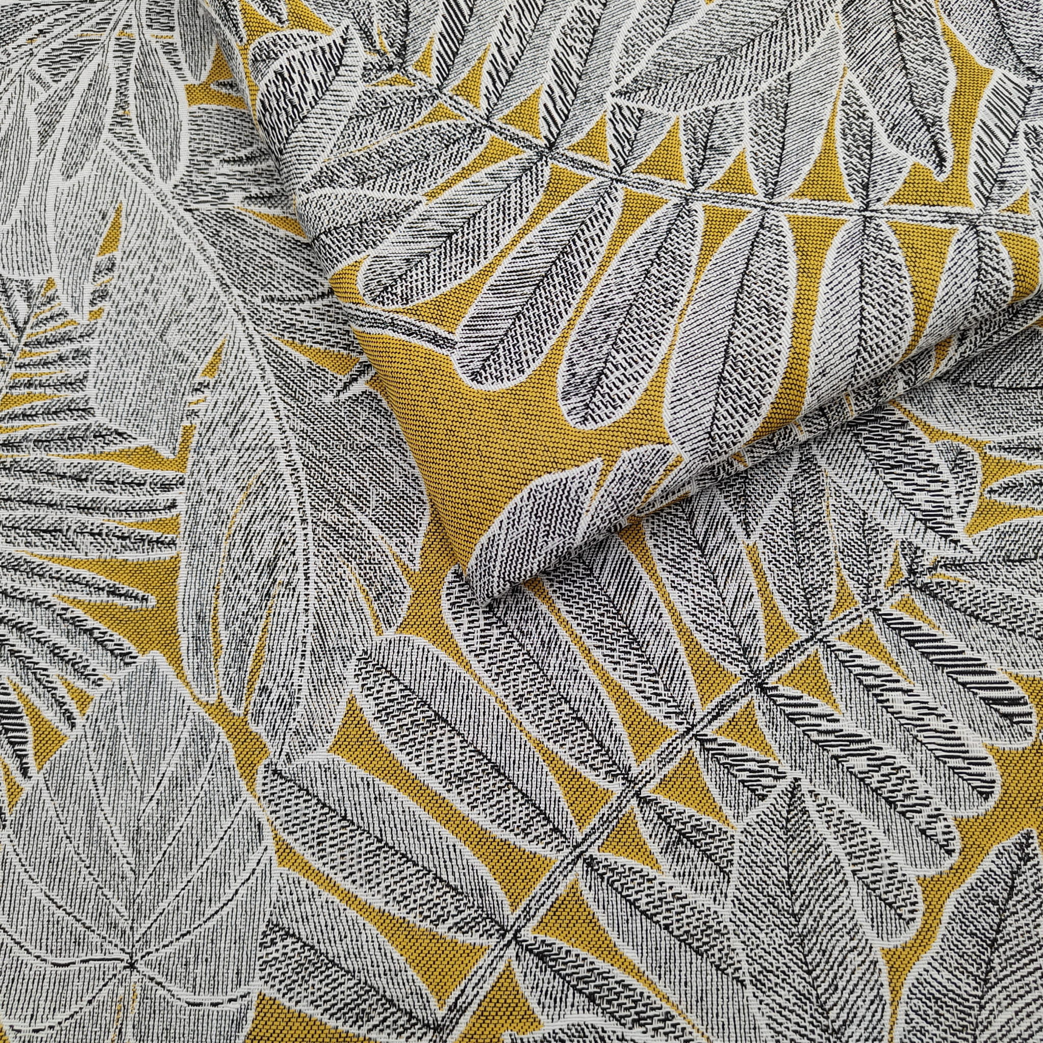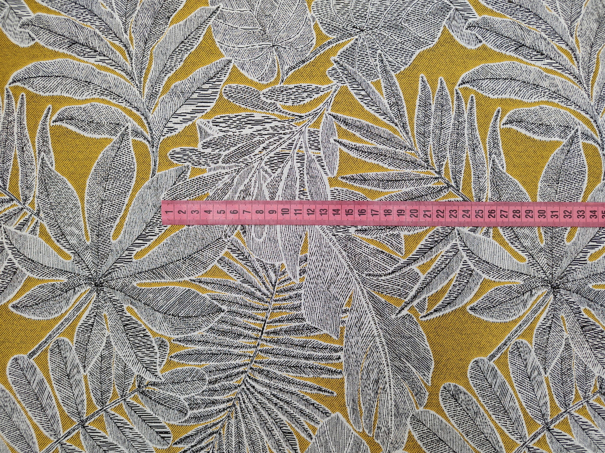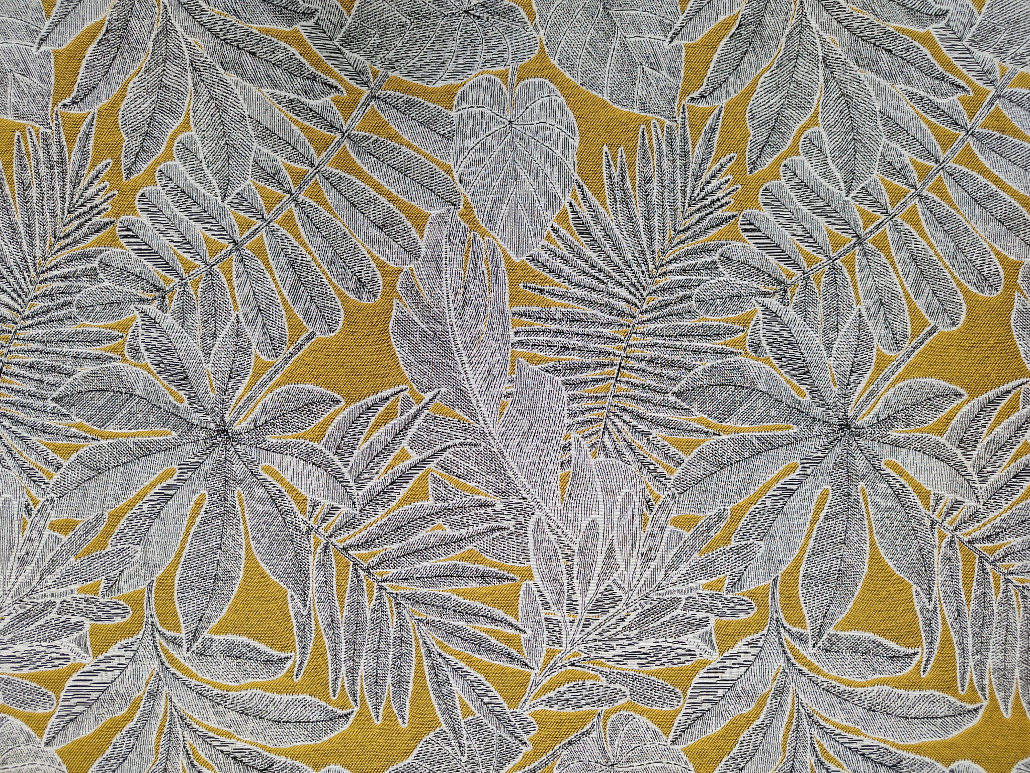 Unikatowa tkanina żakardowa we wzór różnorodnych liści w kolorze szarym na żółtym tle.