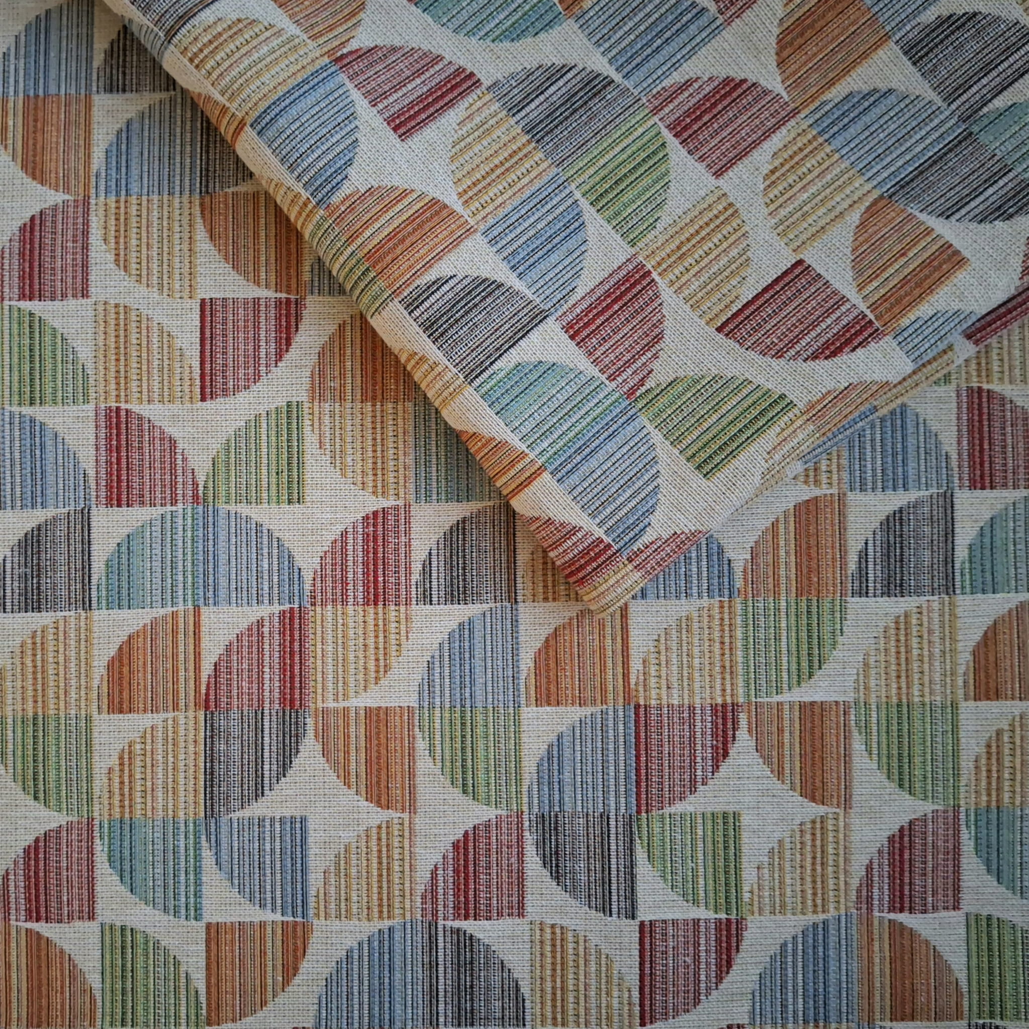 Unikatowa tkanina żakardowa - kolorowe koła w pastelowych odcieniach umieszczone na beżowym tle.