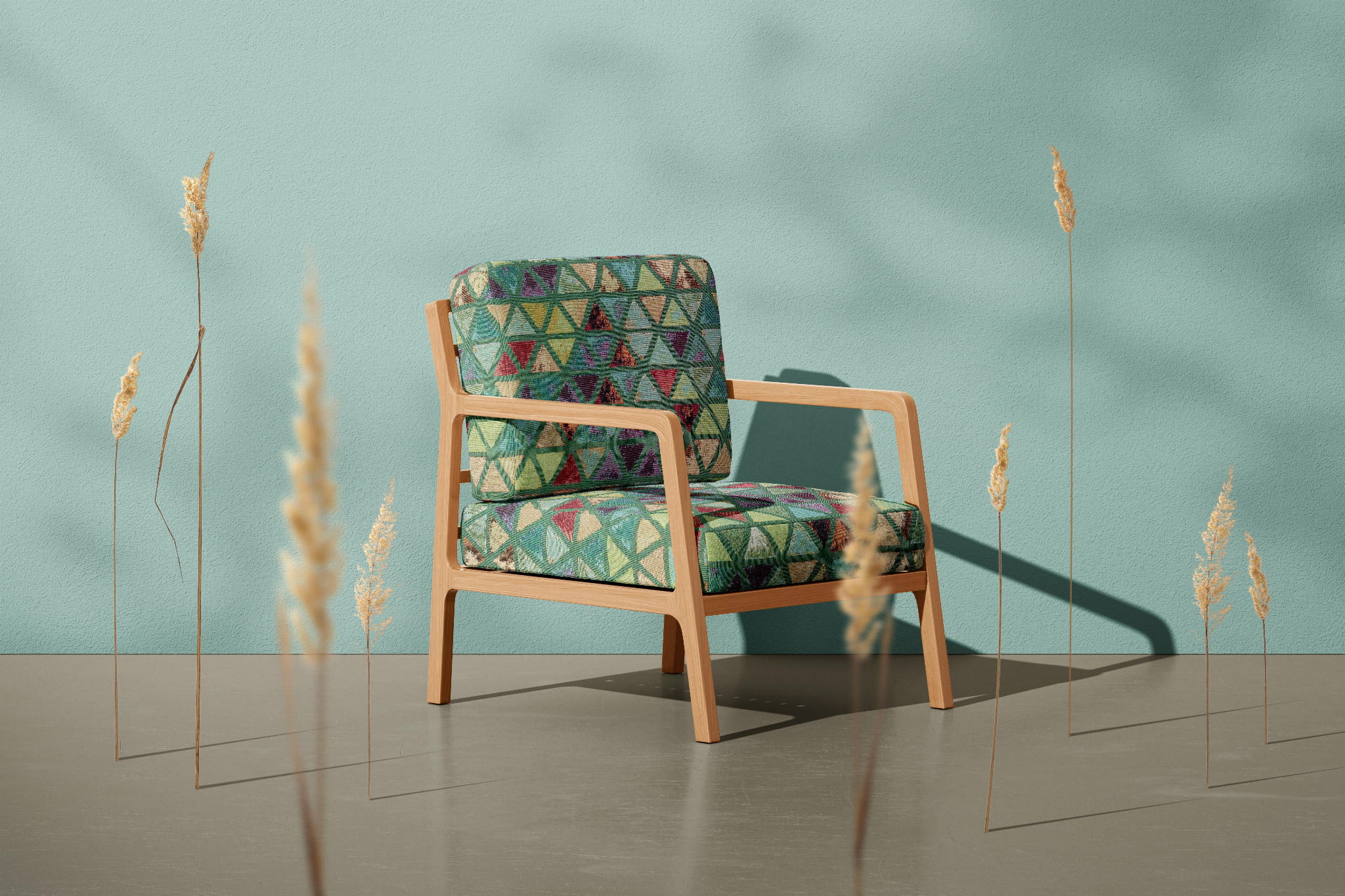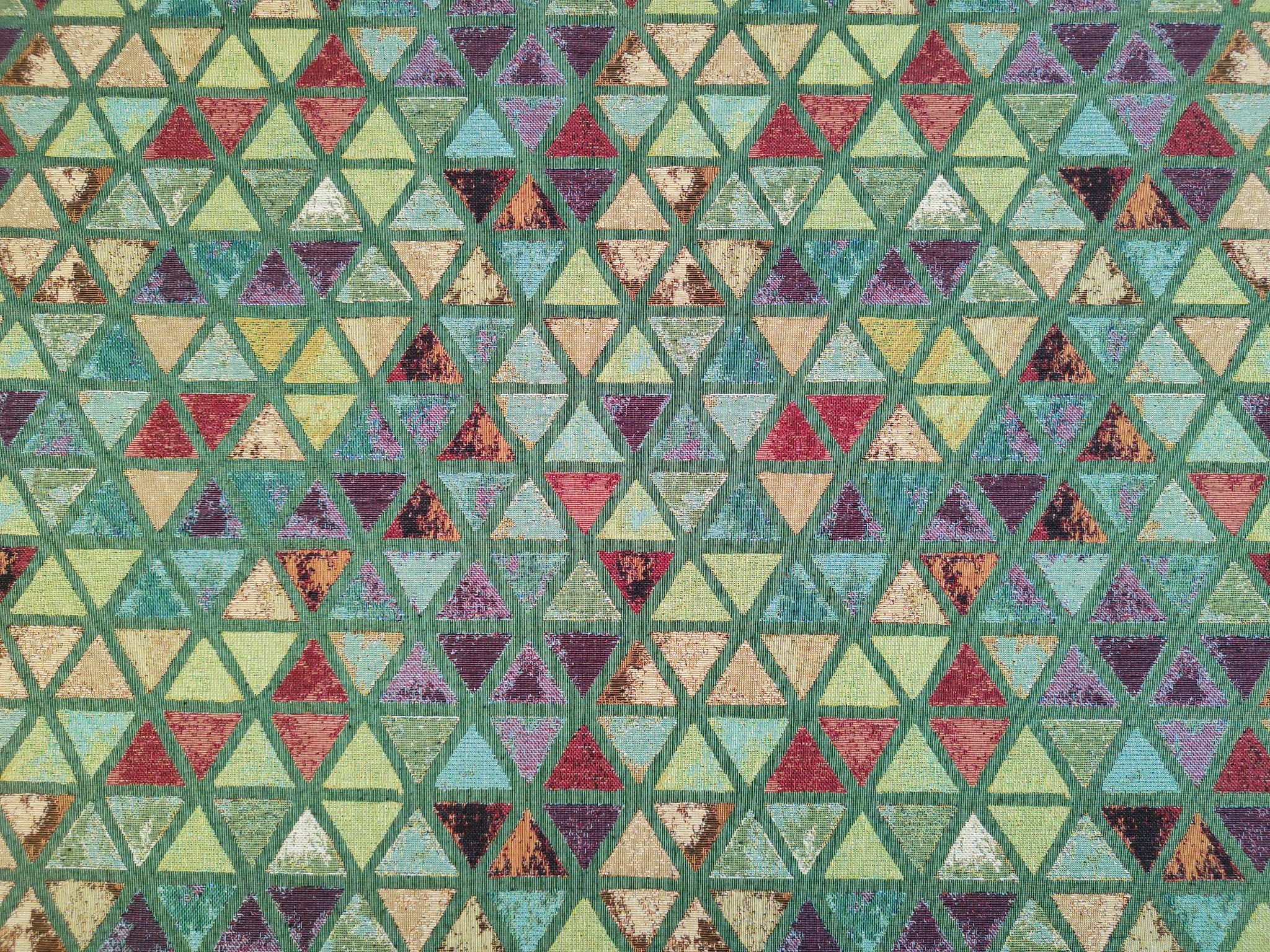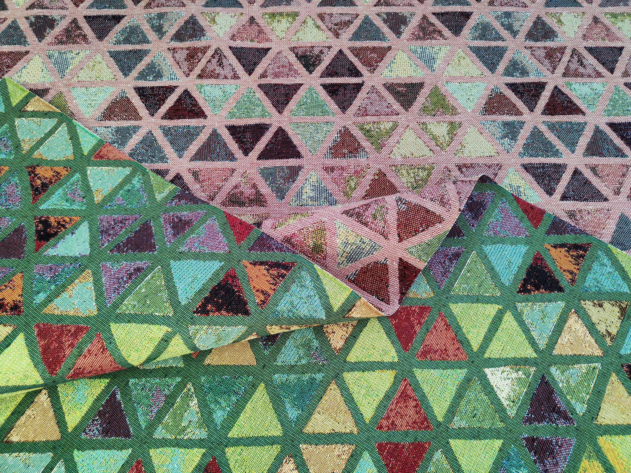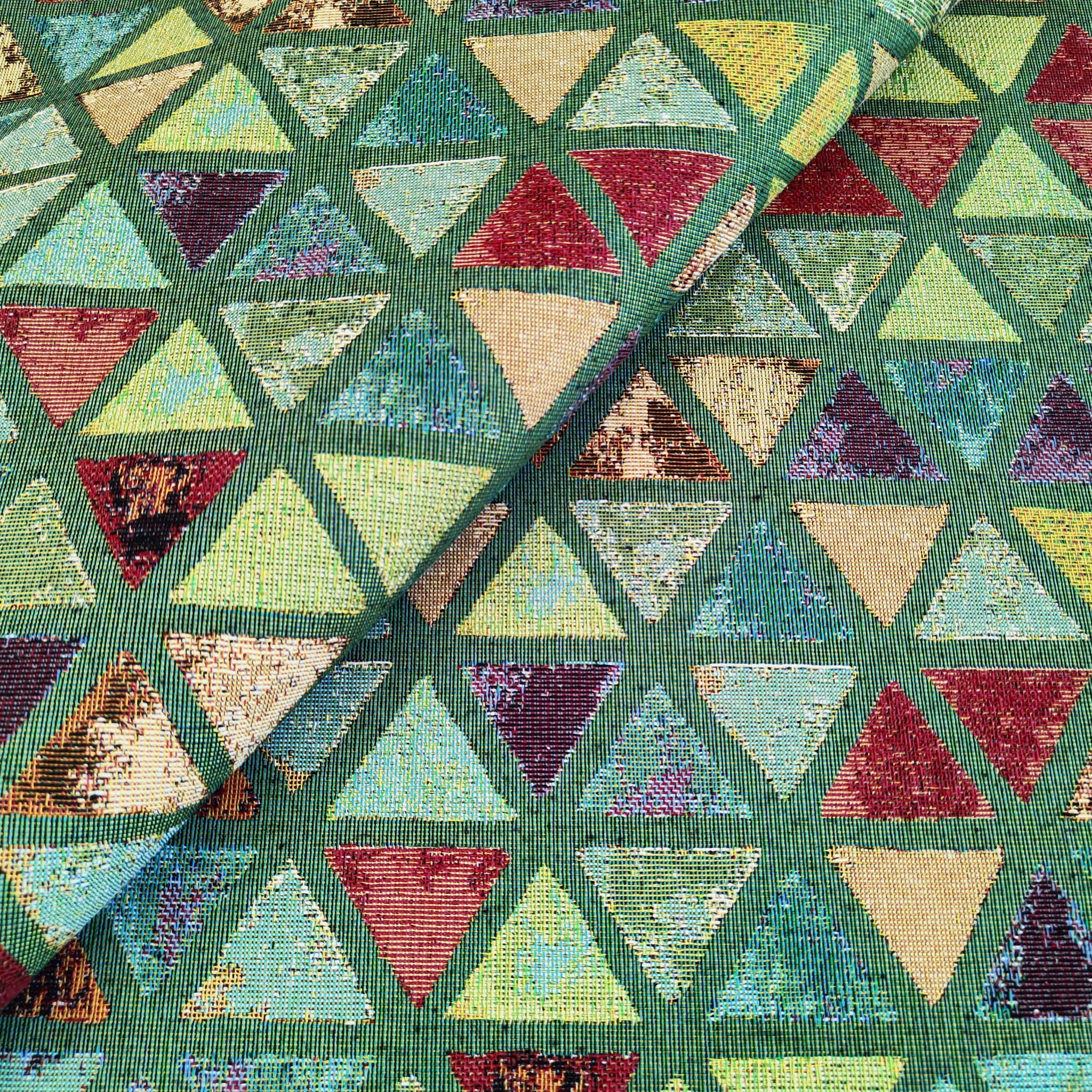 Unikatowa tkanina żakardowa w oryginalny wzór kolorowych trójkątów, w których króluje odcień zieleni.
