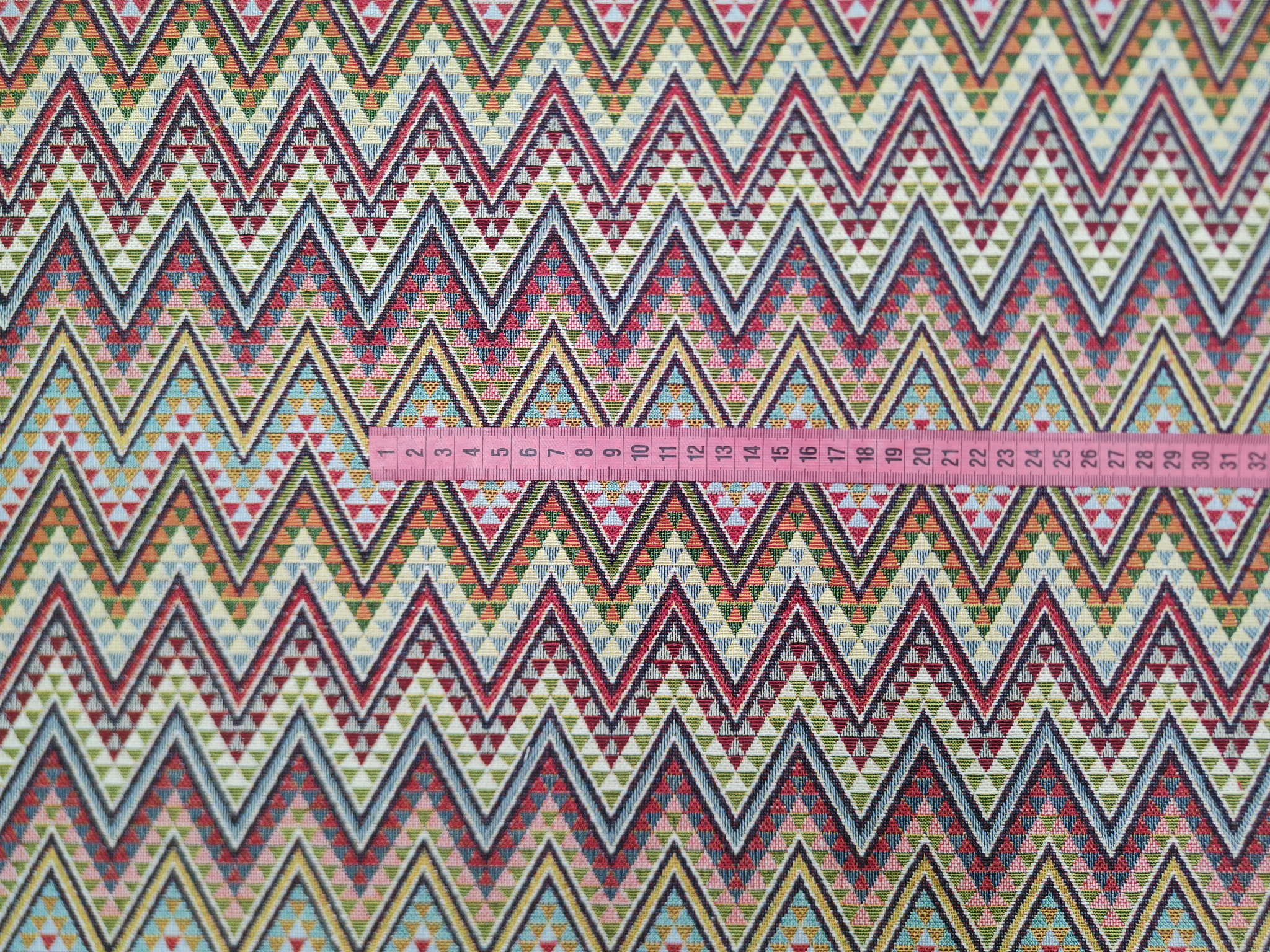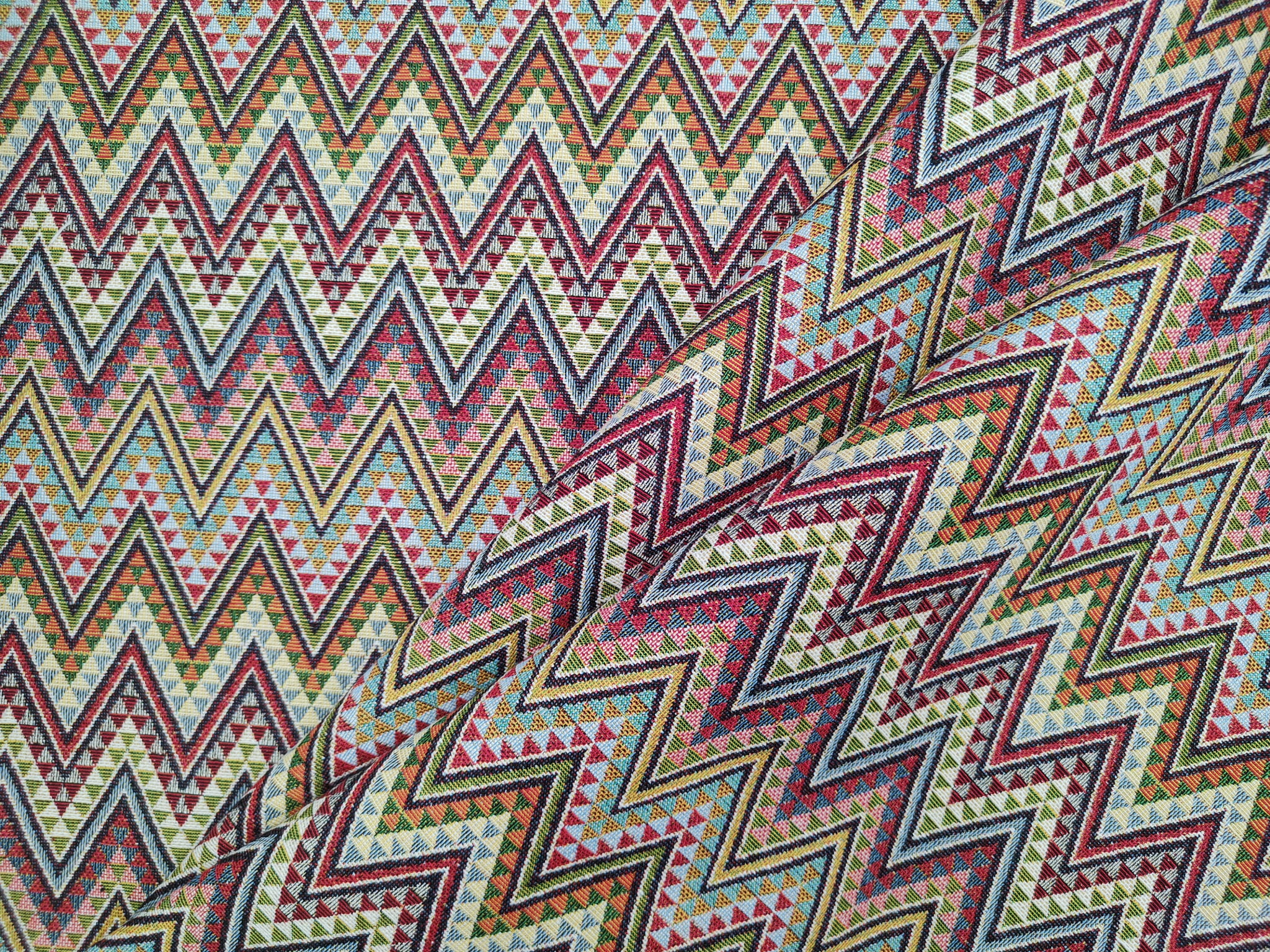 Unikatowa tkanina żakardowa we wzór geometrycznych zygzaków.